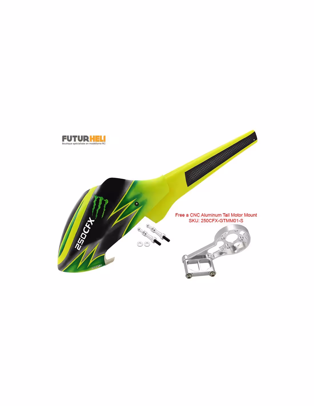 Magnifique fuselage en fibre peint couleur "Monster" pour habiller votre 250CFX . Livré avec support spécial pour le moteur d'anti-couple .