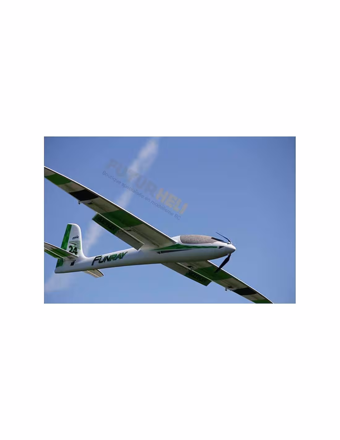 Le FUNRAY MULTIPLEX marque une nouvelle ère dans le domaine des modèles en ELAPOR®. Cet élégant planeur électrique, dynamique, avec ses quatre volets d’ailes saura vous convaincre non seulement par ses caractéristiques de voltige à la pente, mais également par ses performances en plaine, lorsqu’il s’agit de spiraler dans les ascendances. Après une descente vertigineuse avec les ailerons et volets en position Butterfly, l’atterrissage de précision n’est plus qu’un jeu d’enfants. Le FUNRAY se distingue notamment par une précision et une vitesse d’exécution incroyable des figures de voltige. Pour des planeurs en ELAPOR® il s’agit là d’une véritable première ! Ces performances n’ont pu être obtenues que par une conception hybride moderne alliant la fibre de carbone, l’acier inoxydable, l’aluminium, la matière plastique et cette mousse spécifique qu’est l’ ELAPOR®