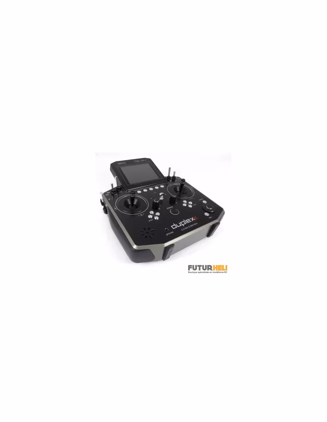 - Avec un système de transmission numérique révolutionnaire, 24 canaux (24 voies + 8 commandes à distance), 2,4 GHz et 900mHz ( 2x émetteurs 2,4ghz et 1x émetteur 900mHz ), à saut de fréquences, est entièrement conçu et fabriqué par Jeti Model en République tchèque. Le concept Duplex est l'un des systèmes de radio les plus avancés et fiable sur le marché. Avec leur solide boîtier en aluminium usiné dans la masse, l'antenne est entièrement intégrée. Elle comporte aussi un mini port USB, un haut-parleur intégré, une prise casque, des manches avec capteurs Hall (résolution de 4096 pas) et 9 roulements à billes pour un mouvement précis. Un grand écran rétroéclairé 320x240 et de nombreuses autres caractéristiques innovantes.