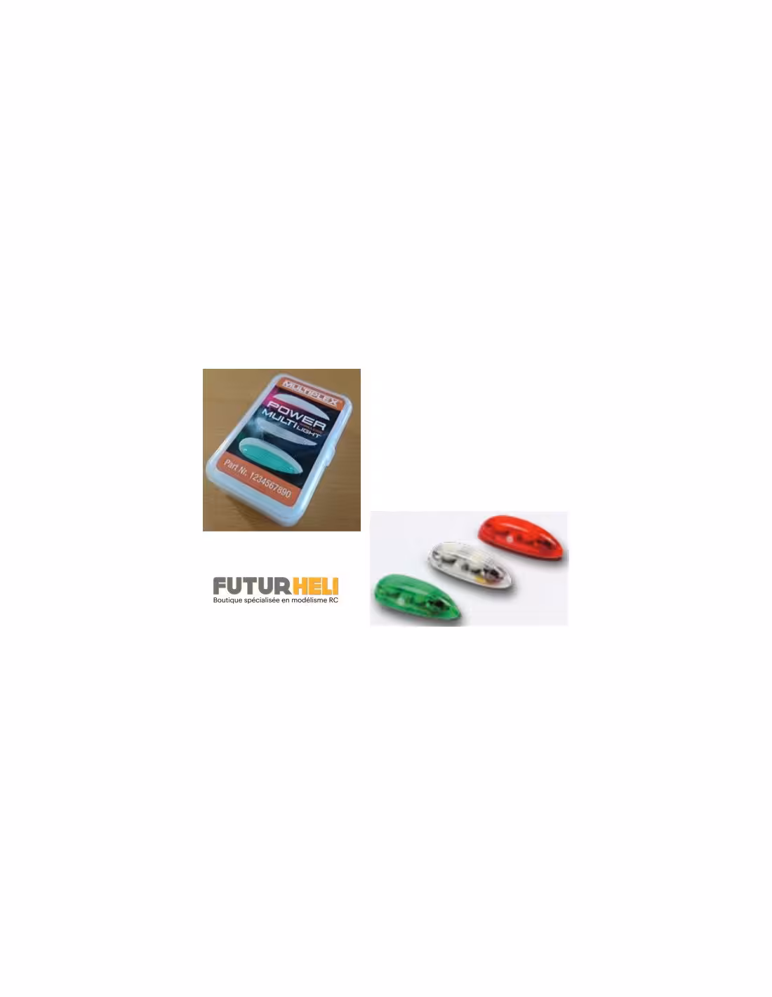- Avec le set d ́éclairage sans cordons POWER MULTIlight Wireless, il est possible d ́équiper pratiquement tous les modèles de façon attrayante en utilisant des pastilles autocollantes ou du velcro. Grâce aux trois couleurs (rouge, vert et blanc) vous disposez d ́un éclairage indiquant la position et lesens de déplacement, afin d ́éviter les collisions. N‘exigeant aucun câblage complexe, ces feux peuvent être fixés sans problème après l’assemblage dumodèle.