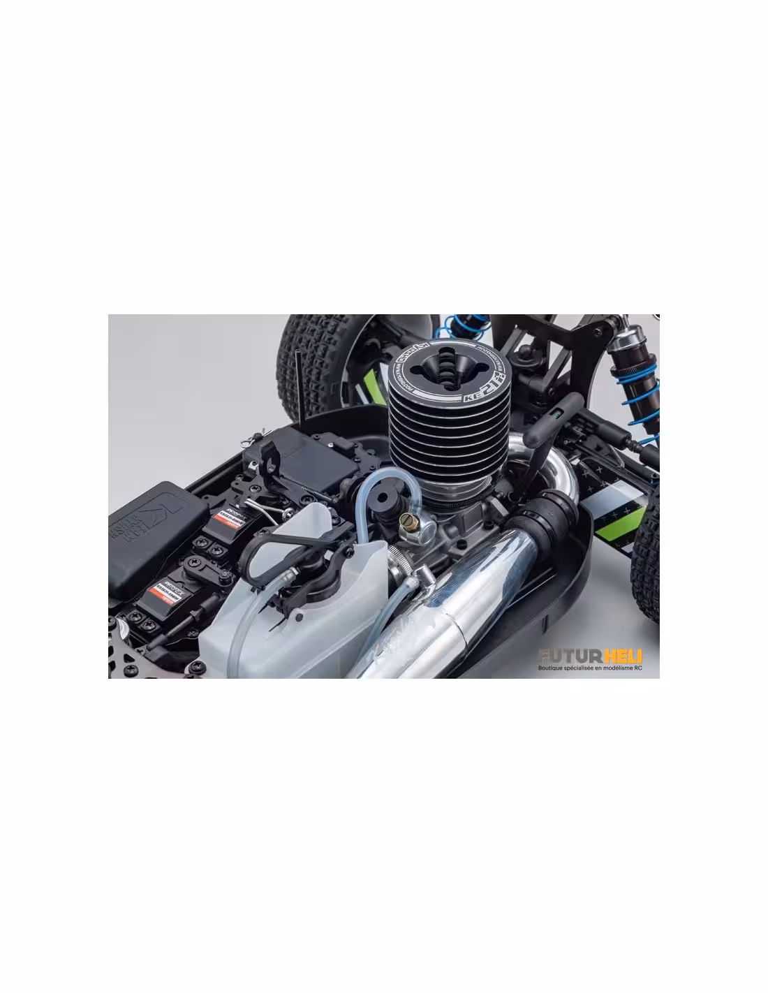 Le moteur à lanceur intégré est le dernier moteur Kyosho KE21SP à sortie d'échappement arrière et à culasse haute.
