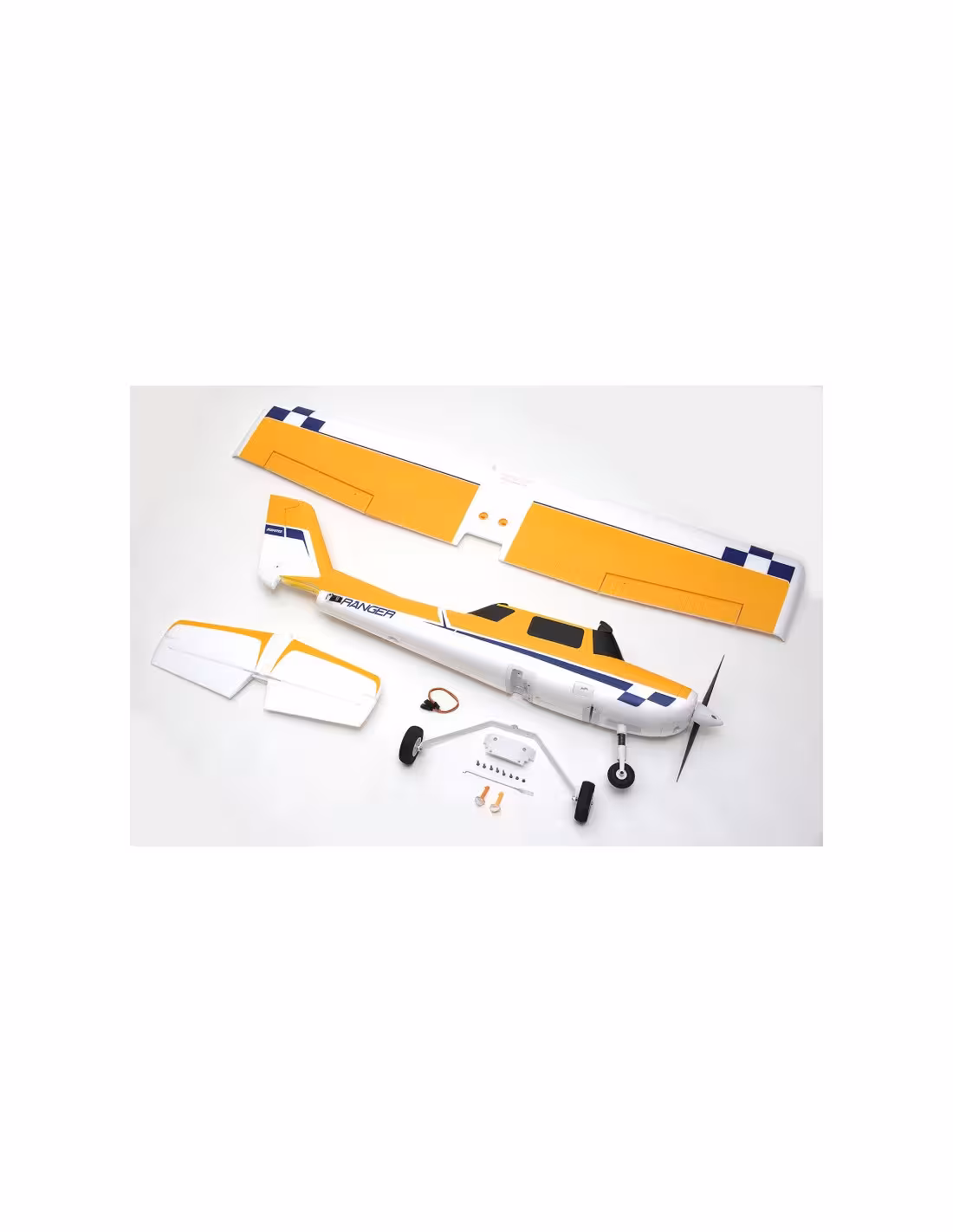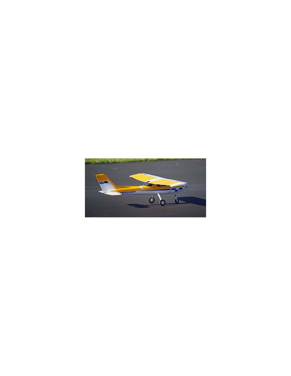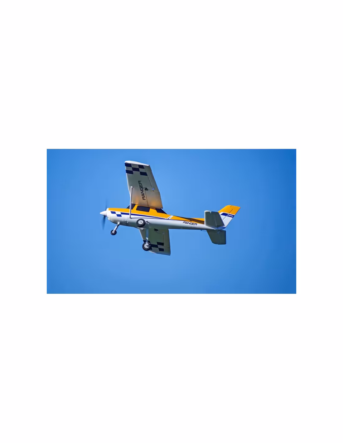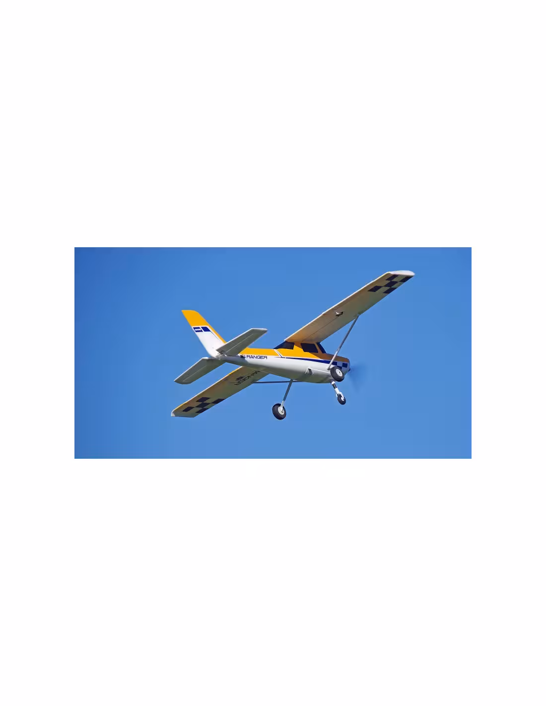 - Fabriquée dans une mousse EPO ultra légère, la configuration à aile haute de la volumineuse cellule assure au Ranger une faible charge alaire et une formidable portance, même à faible vitesse. Les mâts d’aile en plastique robuste ajoutent à la rigidité de la voilure en voltige et le train tricycle à haute résistance fait du taxiage un vrai régal.