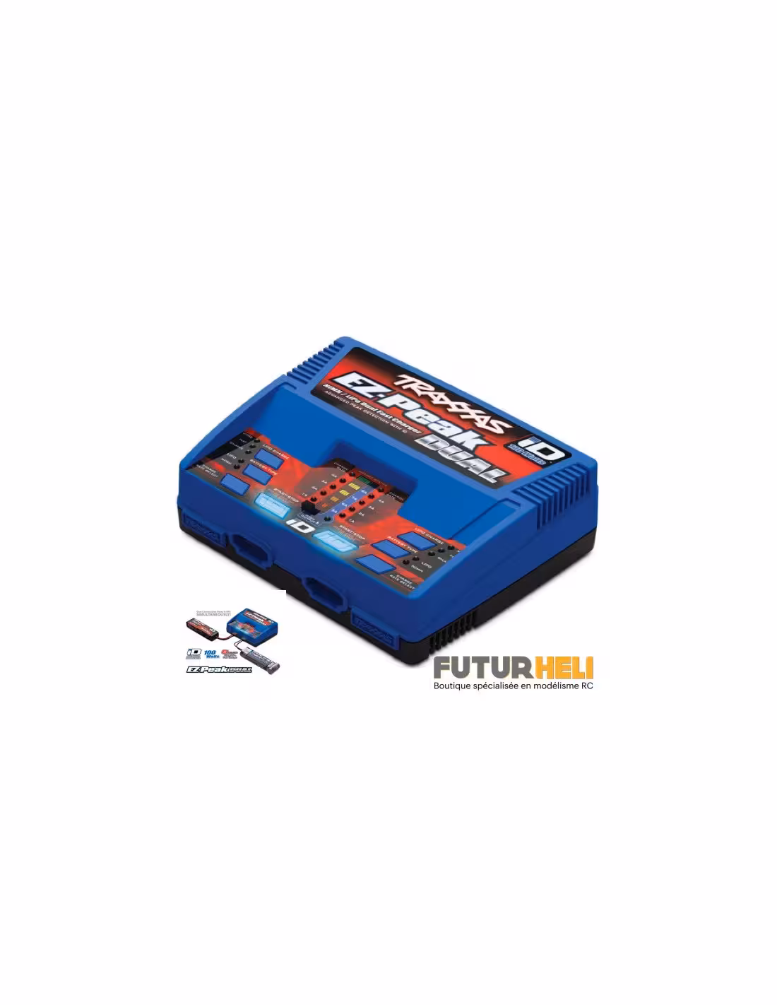 - Branchez simplement une paire de batteries Traxxas et pressez le bouton « Start ». La technologie iD exclusive à Traxxas élimine la programmation compliquée des chargeurs traditionnels en configurant et en optimisant de façon automatique les réglages de charge pour les batteries iD Traxxas. L’EZ-Peak Dual charge deux batteries simultanément avec un courant de charge allant jusqu’à 50 watts (4 ampères) pour chacune d’elle. Vous pouvez également opter pour le mode « haute puissance » afin d’obtenir un courant de charge maximal de 100 watts (8 ampères) pour la charge d’une seule batterie.