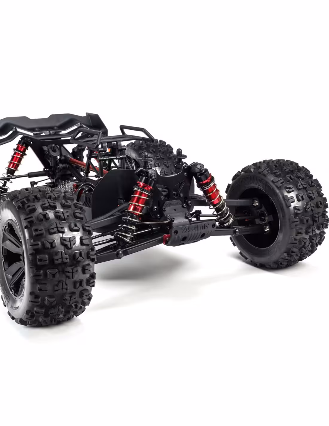 ARRMA® utilise un solide châssis en aluminium anodisé comme base pour assurer la résistance nécessaire aux performances intenses d’une propulsion brushless. Un nouveau support de carrosserie central et un contreventement en aluminium ainsi que des renforts latéraux en composite ajoutent encore de la solidité. Les entraînements de différentiel entièrement métalliques et les pignons internes en acier fournissent une transmission fiable et robuste qui résiste aux cascades extrêmes et aux défoncements à grande vitesse. Un nouveau sauve-servo de direction en aluminium « ne se desserrant jamais » offre plus de précision et de fiabilité