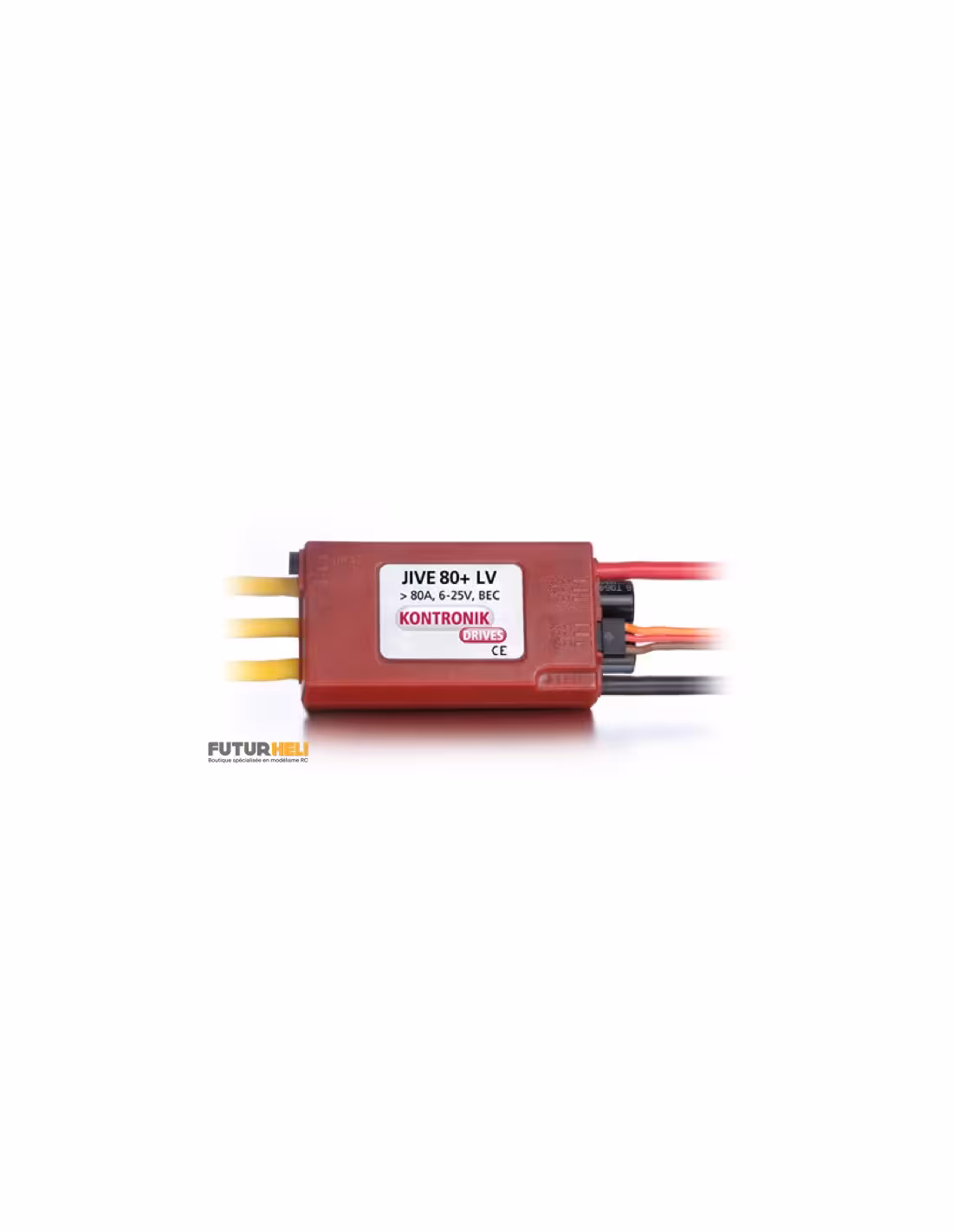 Kontronik Contrôleur Jive 80+ LV Bec 5A la référence cet ESC possède un refroidissement optimisé et a également un bec très puissant surtout pour les hélicoptères ou il y a de nombreux servos puissants.