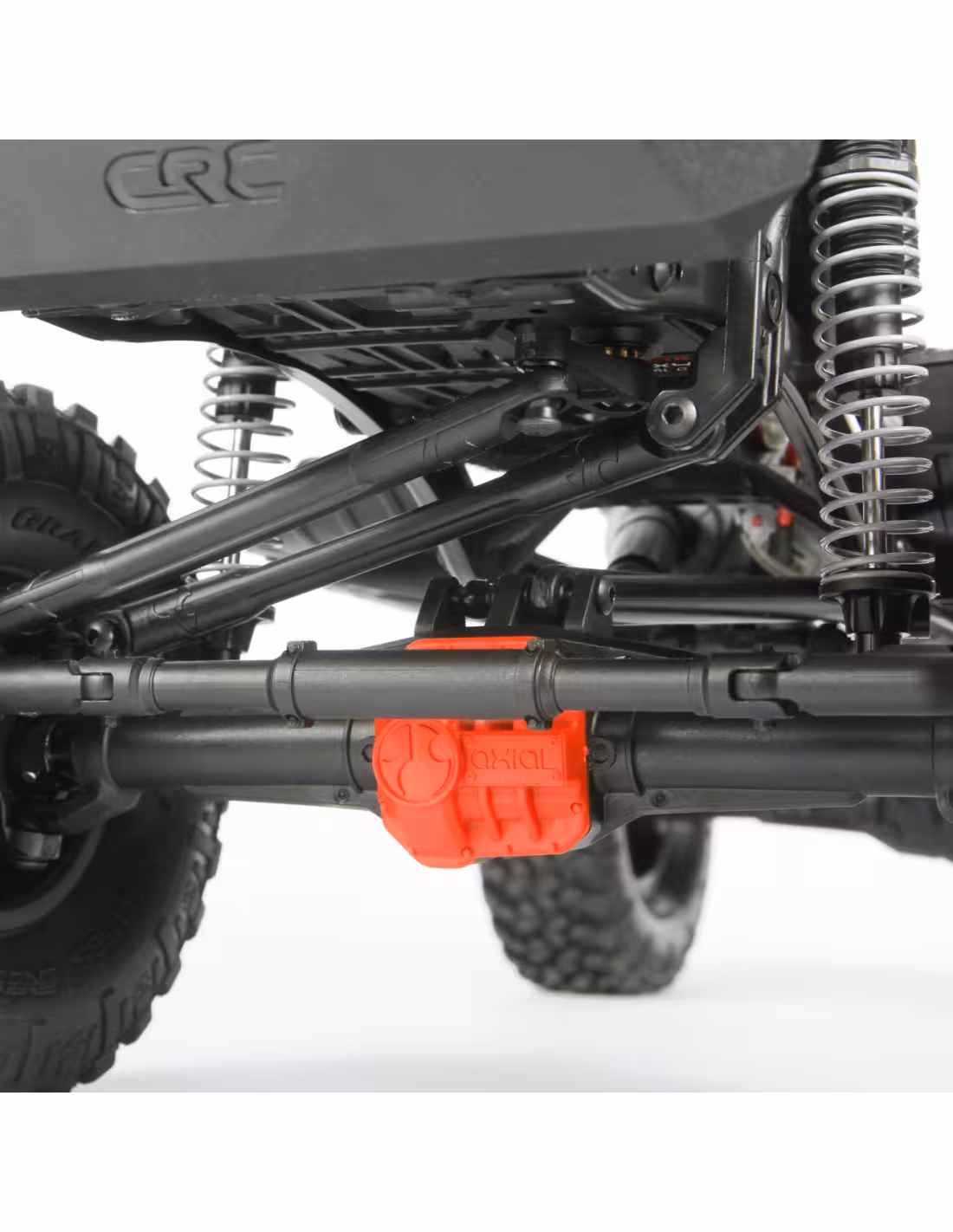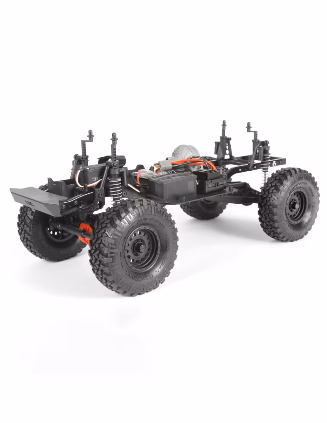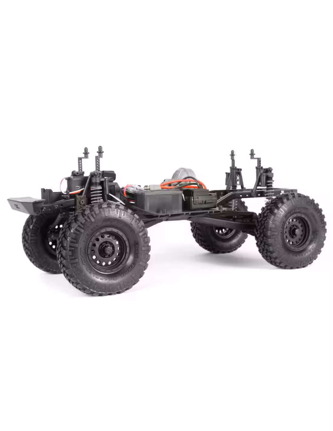 - Sous la coque vert se trouve le SCX10 II, un châssis fiable qui reprend l'esprit du SCX10 mais avec 98% de nouvelles pièces comme par exemple la transmission AR44, les cardans, les supports de Servo, le bac à batterie, le boîtier de transmission Low CG,...