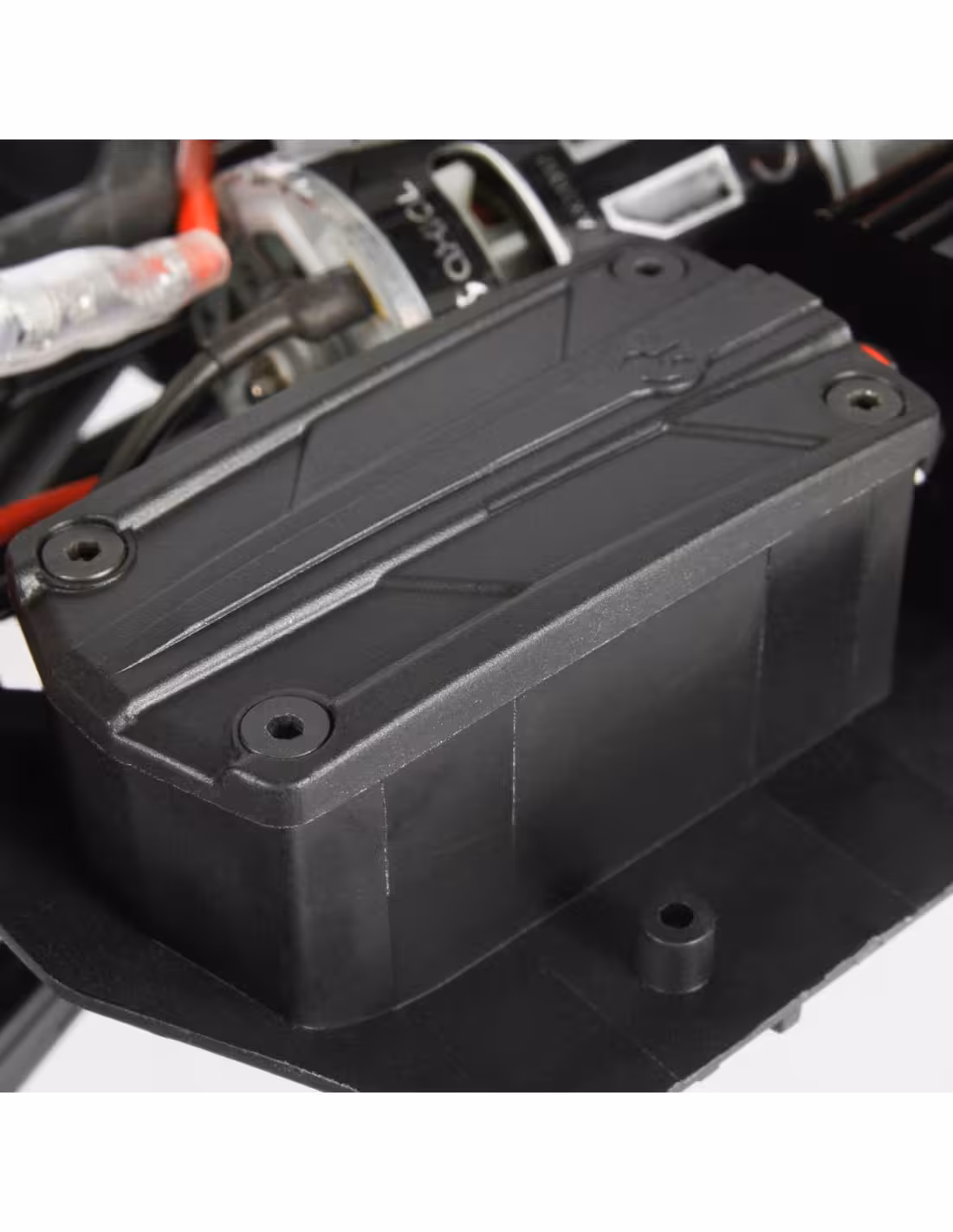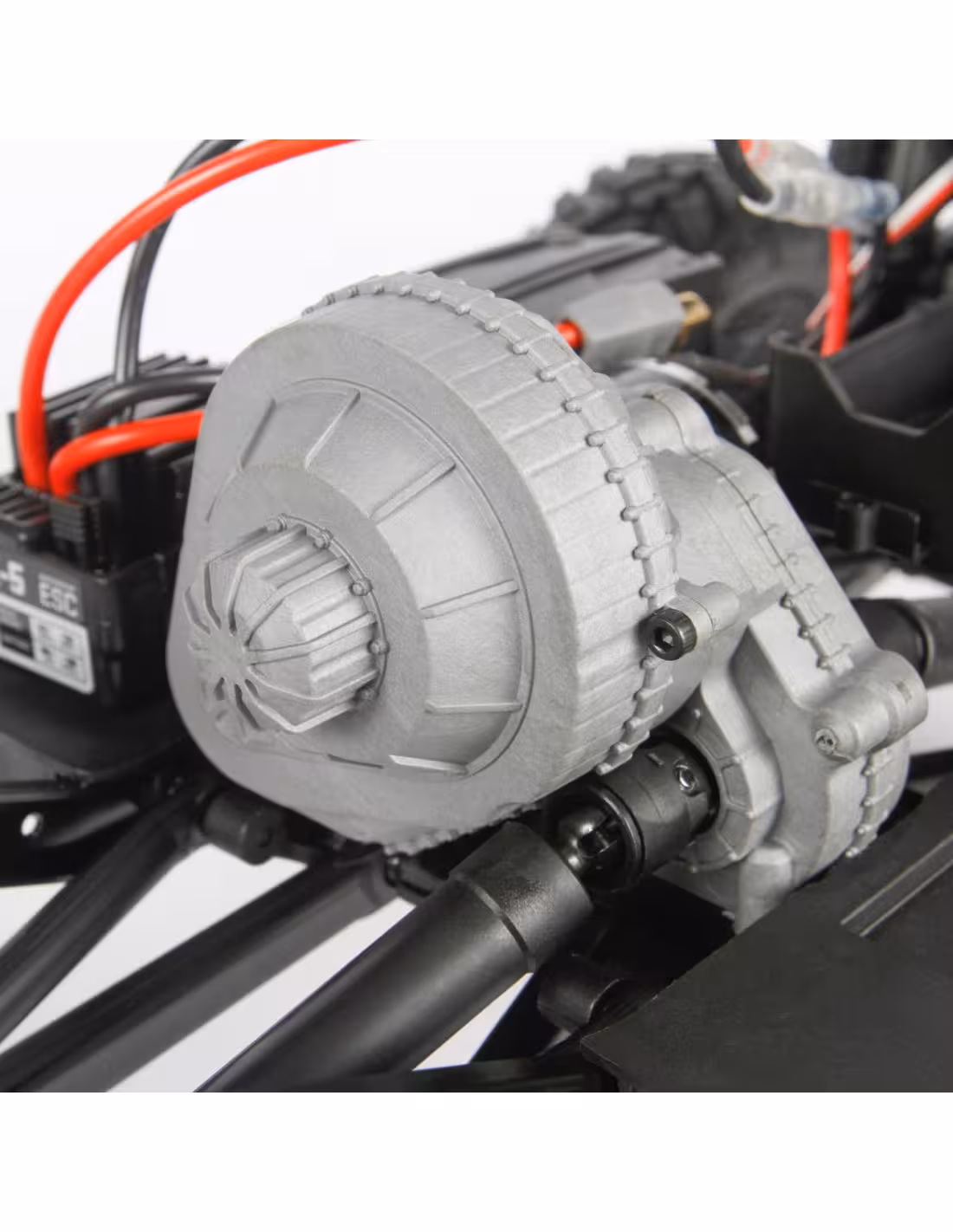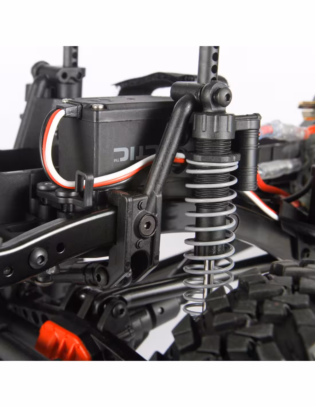 - Sous la coque vert se trouve le SCX10 II, un châssis fiable qui reprend l'esprit du SCX10 mais avec 98% de nouvelles pièces comme par exemple la transmission AR44, les cardans, les supports de Servo, le bac à batterie, le boîtier de transmission Low CG,...