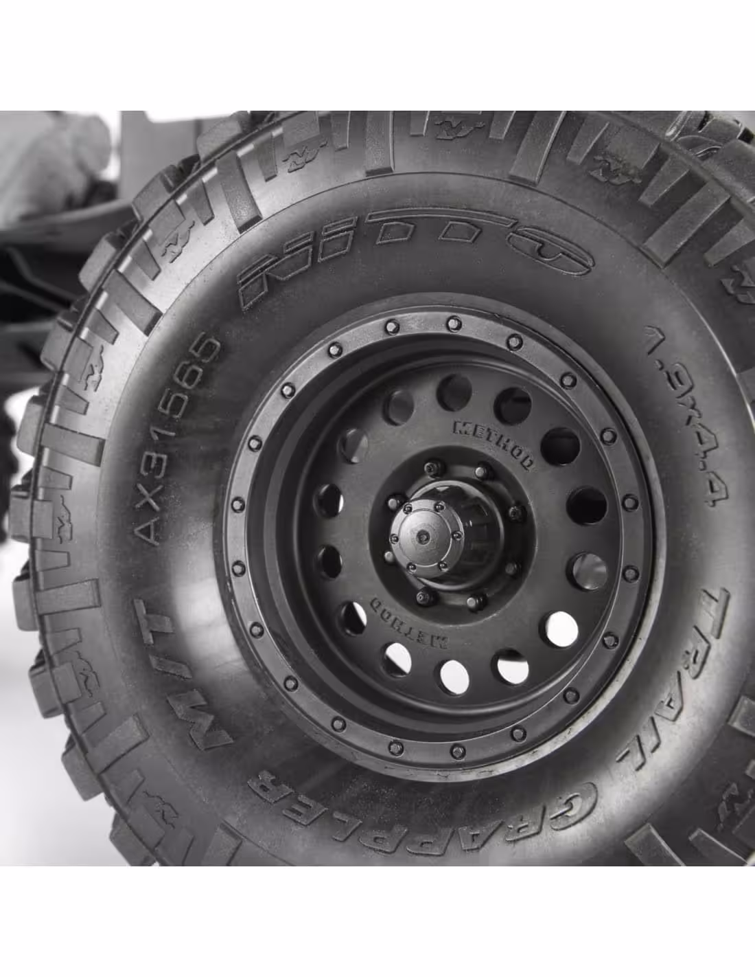 - La carrosserie du Deadbolt est maintenant recouverte d'une superbe peinture olivetout en conservant les caractéristiques d'origine que vous aimez tant : l'étroitesse, le capot bombé, la figure de conducteur très réaliste, la cage extérieure avec une barre lumineuse (LEDs vendues séparément). Le pare-chocs avant CRC et les roues Method Hole 1.9, montés avec des pneus Nitto Trail Grappler, complètent l'ensemble.