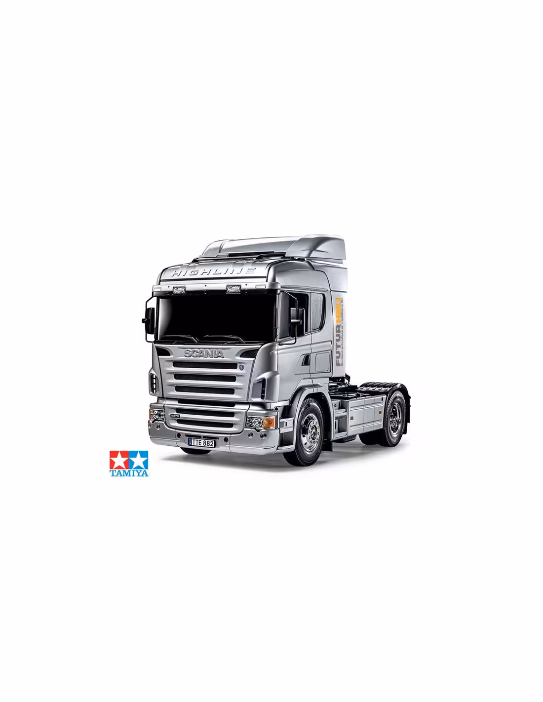 Tamiya 56364 Scania R470 nouvelle édition,la cabine est déjà peinte en gris "TS-17" et pour une finition parfaite celle ci est recouverte d'un vernis polyuréthane qui donne de la profondeur à la peinture . le kit est à assembler zt divers accessoires sont à ajouter comme la batterie de propulsion la radio le servo de direction.