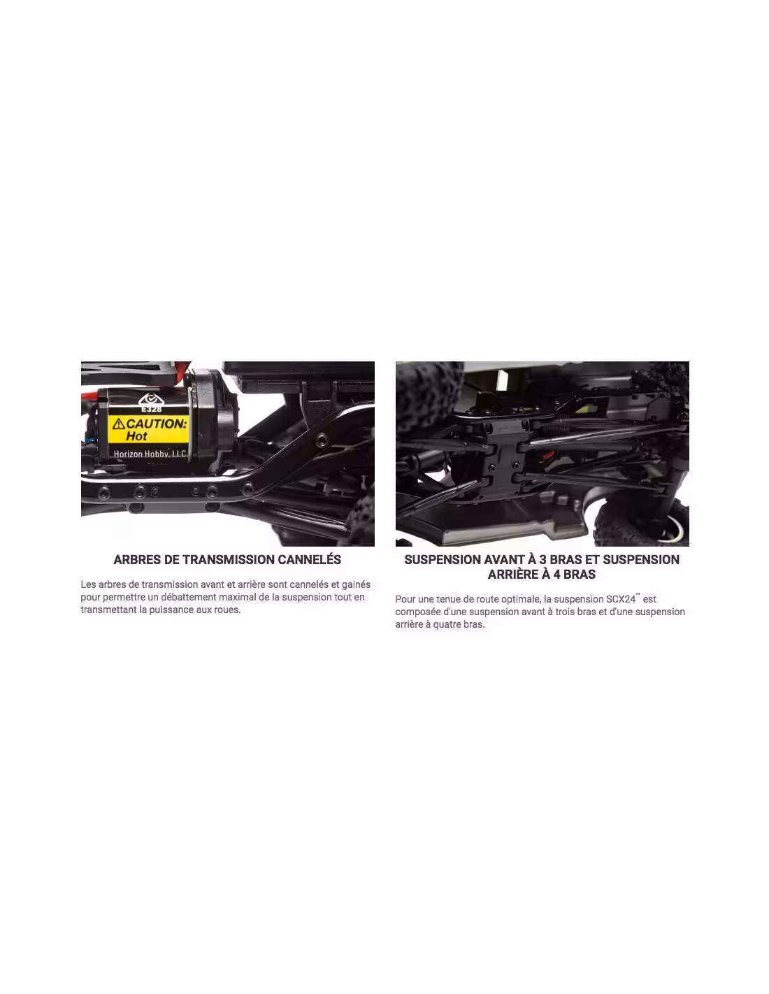 - Comme la plate-forme SCX10™ à l'échelle 1/10, le châssis SCX24™ est équipé de rails en acier robuste et solide à canal C avec des renforts pour maintenir les composants intacts et alignés. Des cornières en acier et des essieux avant et arrière assurent la solidité et la lonévité pour les montées difficiles et les sentiers accidentés. Même à cette petite échelle, la combinaison d'amortisseurs de type "coilover" et de liaisons de suspension en plastique résistant offre les performances de franchissement que vous connaissez et que vous attendez d'Axial®.