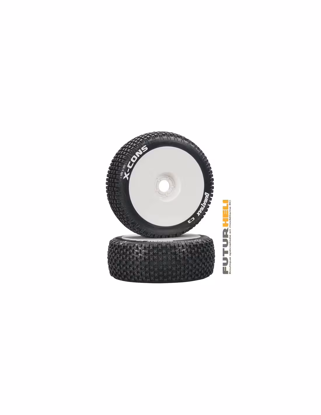 Roues complètes pour buggy 1/8eme hexagone de 17mm pour une jante de 2,2 pouces et d'un pneu de 3 pouces. Mousse intérieur Super Soft .Ce modèle est fait pour les sols limoneux et les sols dur humide ils seront également très performant sur les pistes abrasives et sèches. livré par 2 roues complètes elles sont vite identifiable grâce à leur marquage sur les flancs.