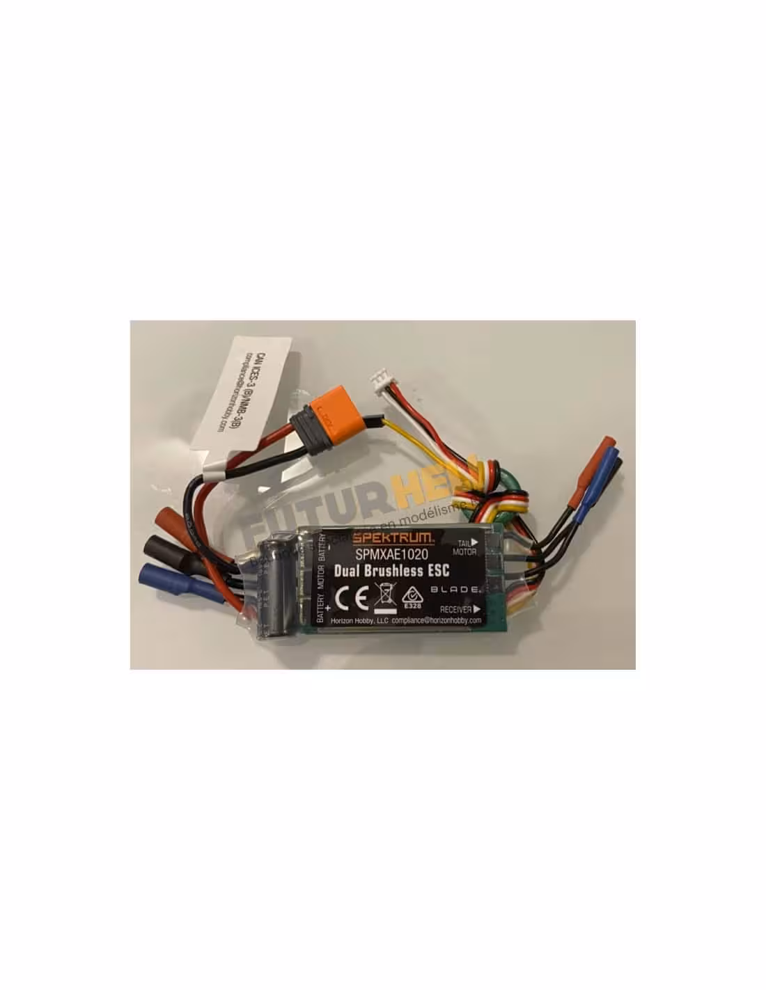 Variateur double de remplacement pour blade 230S Smart équipé de la nouvelle prise IC2 il gère le moteur principal et le moteur d'anti-couple. Pièce d'origine Spektrum Smart technology. Livré avec autocollants Smart.