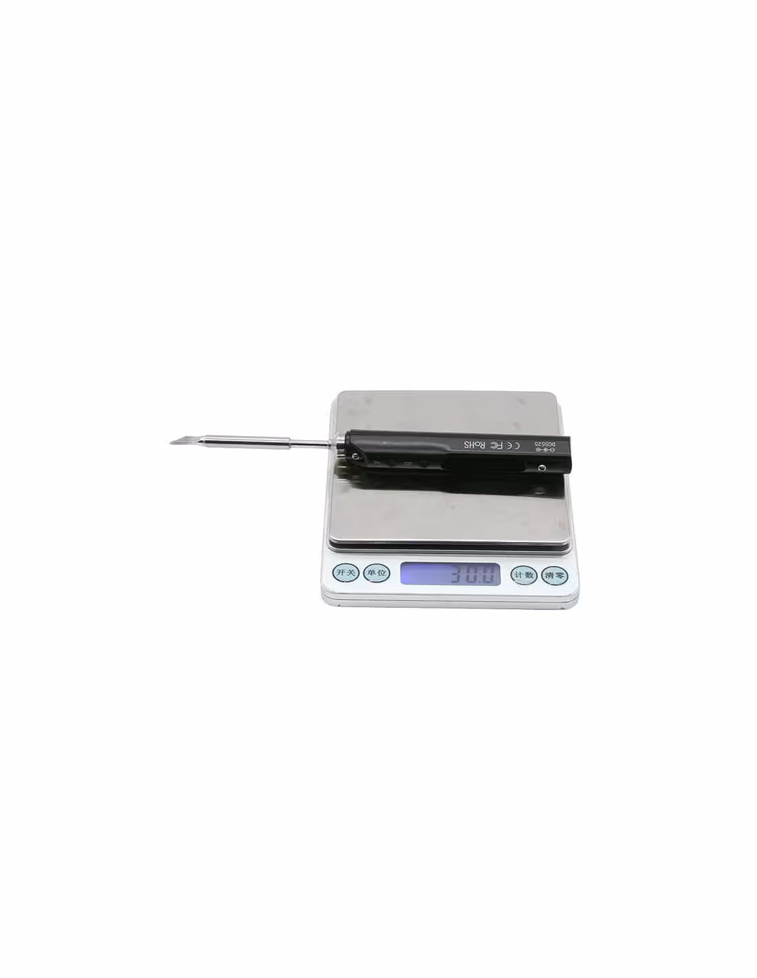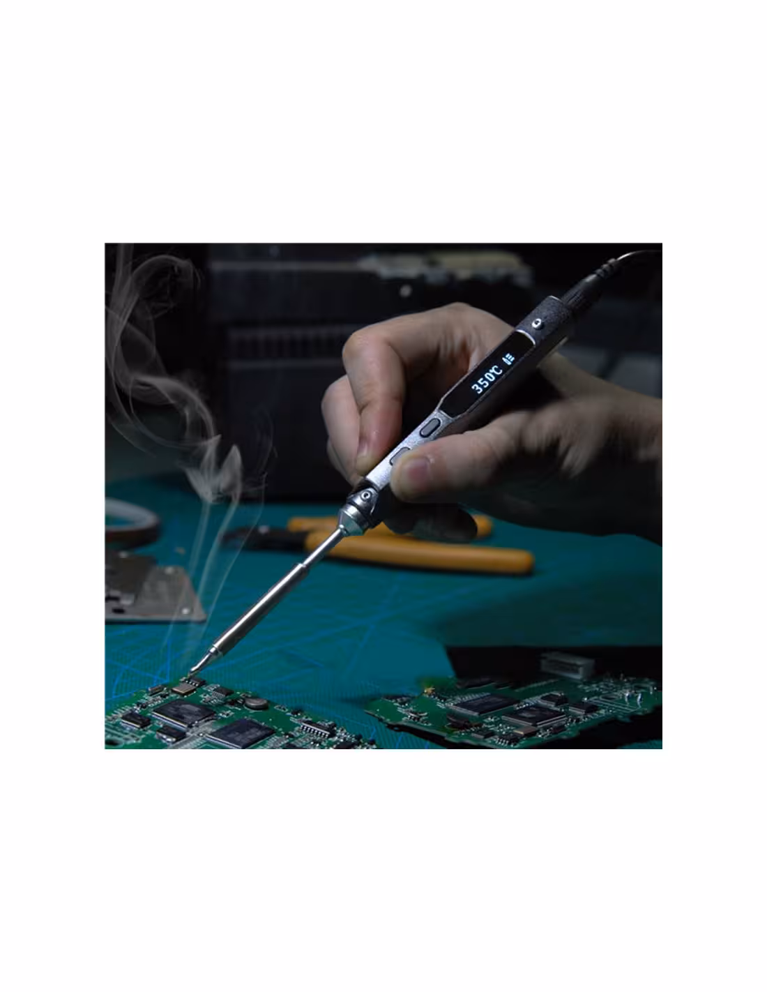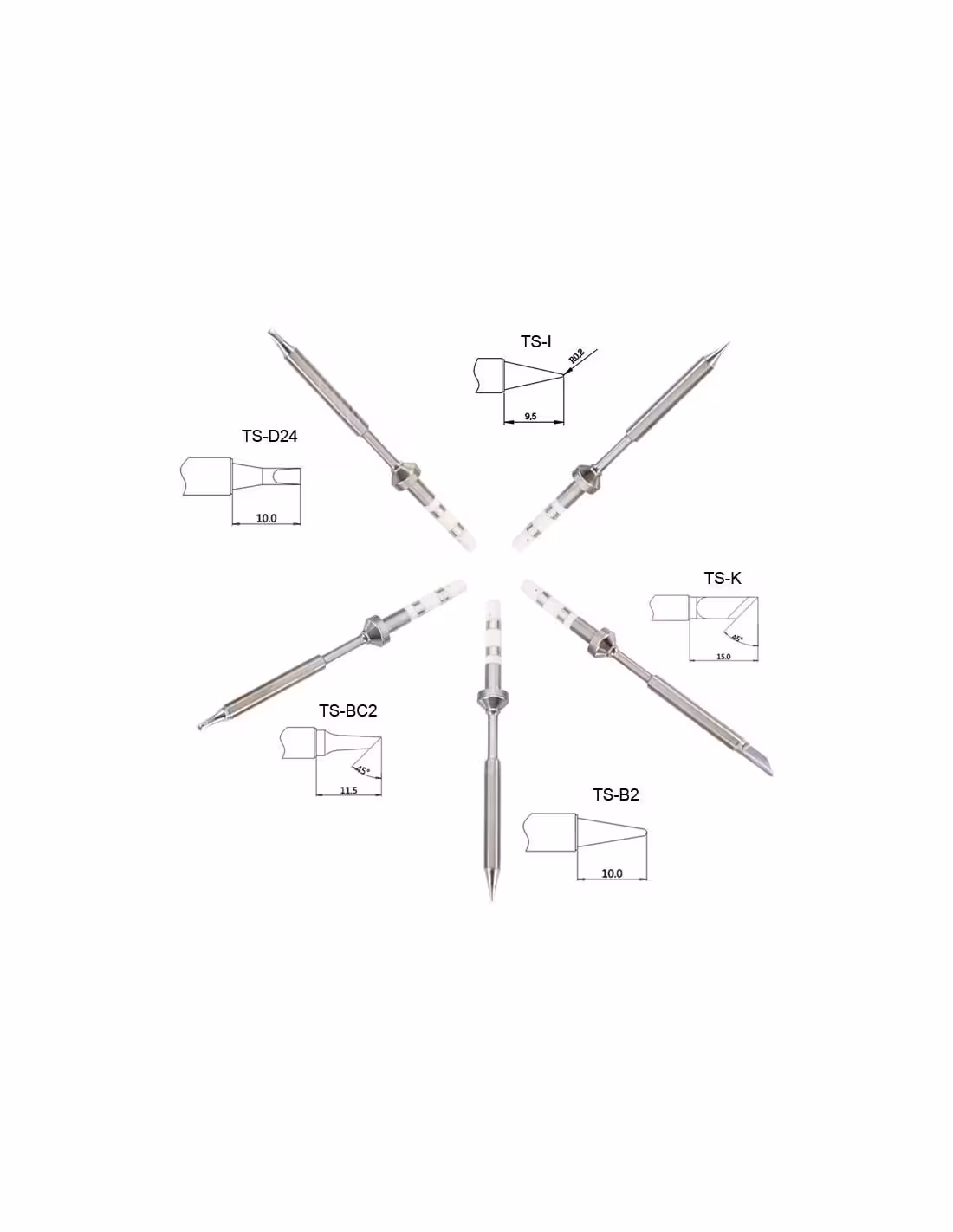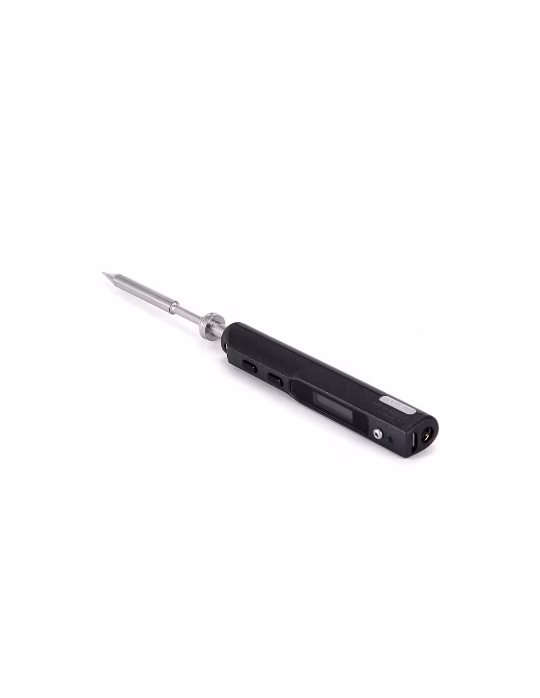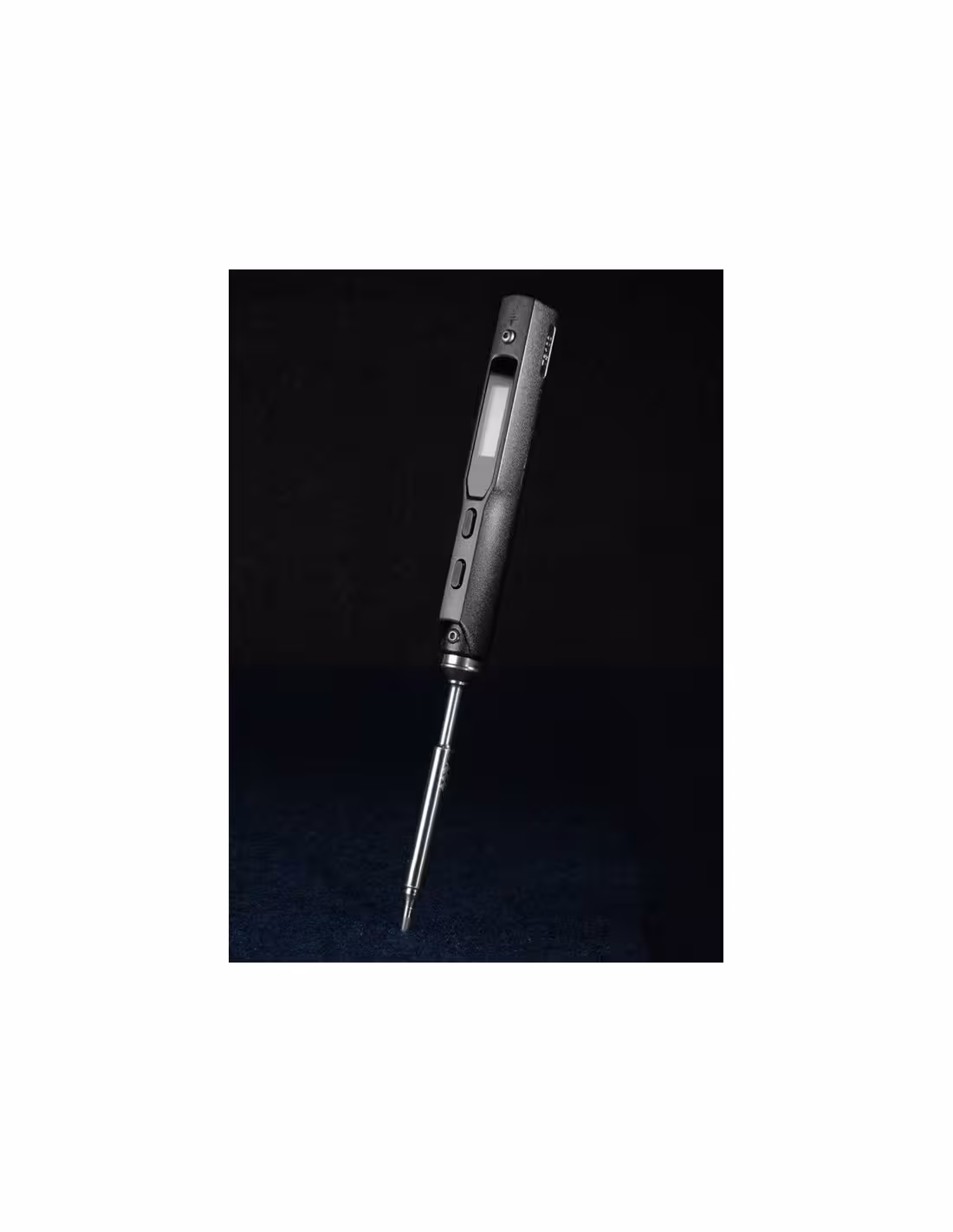 - Le fer TS100 utilise une coque en acier inoxydable imbriquée dans du polycarbonate. Il est muni d'un circuit de sécurité et d'une structure antistatique, intégrée avec un connecteur DC5525 acceptant 12 à 24 V. Il possède deux capteurs de température et des capteurs accélérés avec puce STM32. Grâce à ces particularités, la température est contrôlée avec précision, reste stable, et peut être ajustée entre 100 et 400 °C. Le TS100 offre aussi un mode "sommeil" et une alarme automatique de surchauffe.