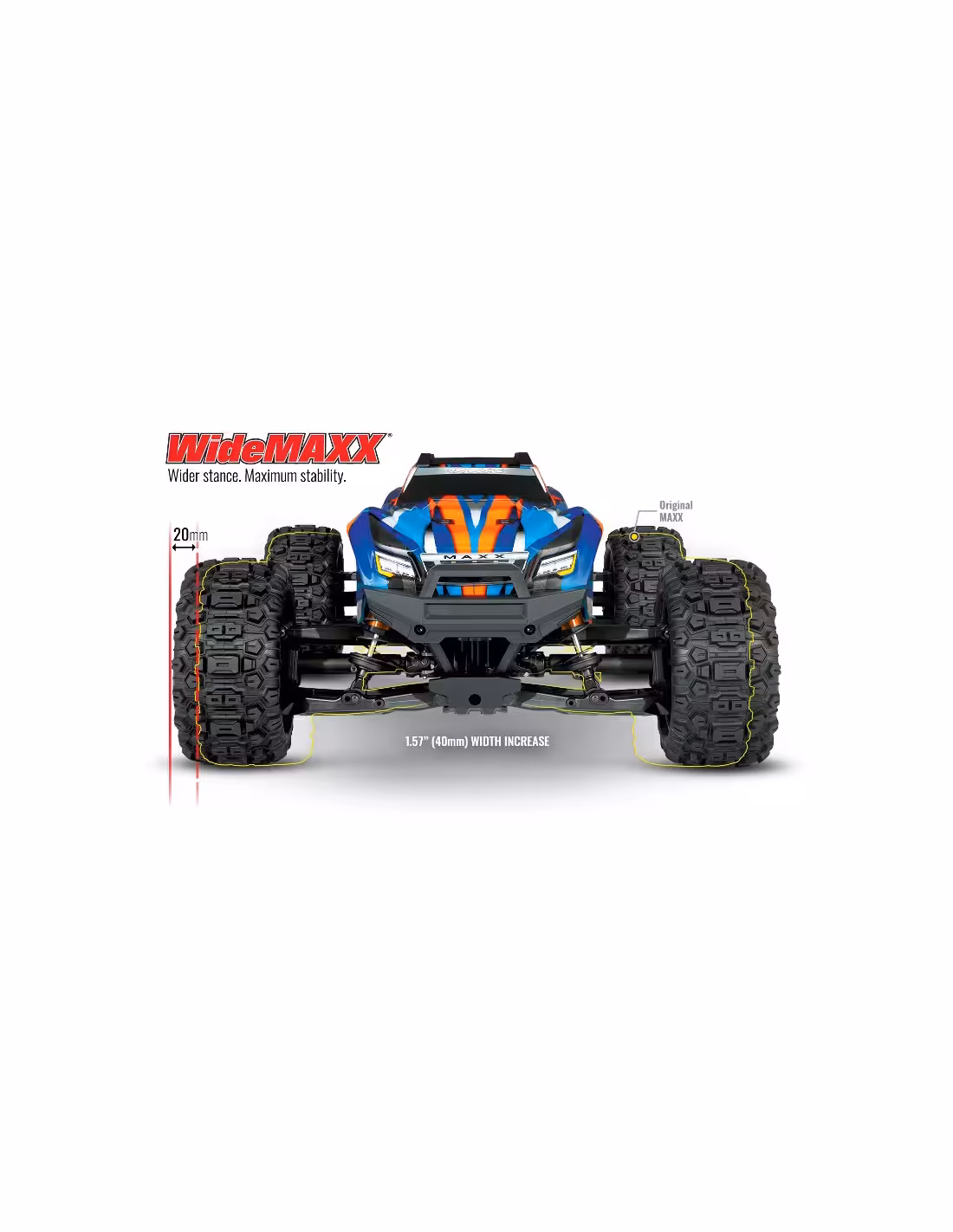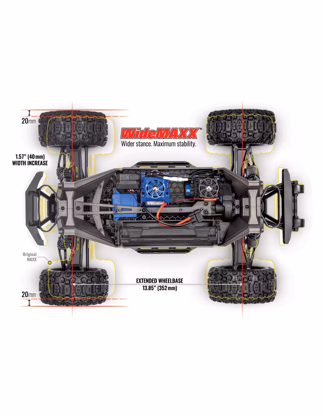 Désormais, le tout nouveau Maxx WideMaxx est encore plus grand, avec un empattement plus long, des pneus Sledgehammer. Il peut atteindre la vitesse de plus de 96 km/h équipé de batterie 4 éléments l'autonomie est également plus grande car son châssis à été redessiner pour accepter des batteries de 6700 mAH.Si vous possédé déjà des accus d'une autre capacité il sera possible de les loger sans problèmes.