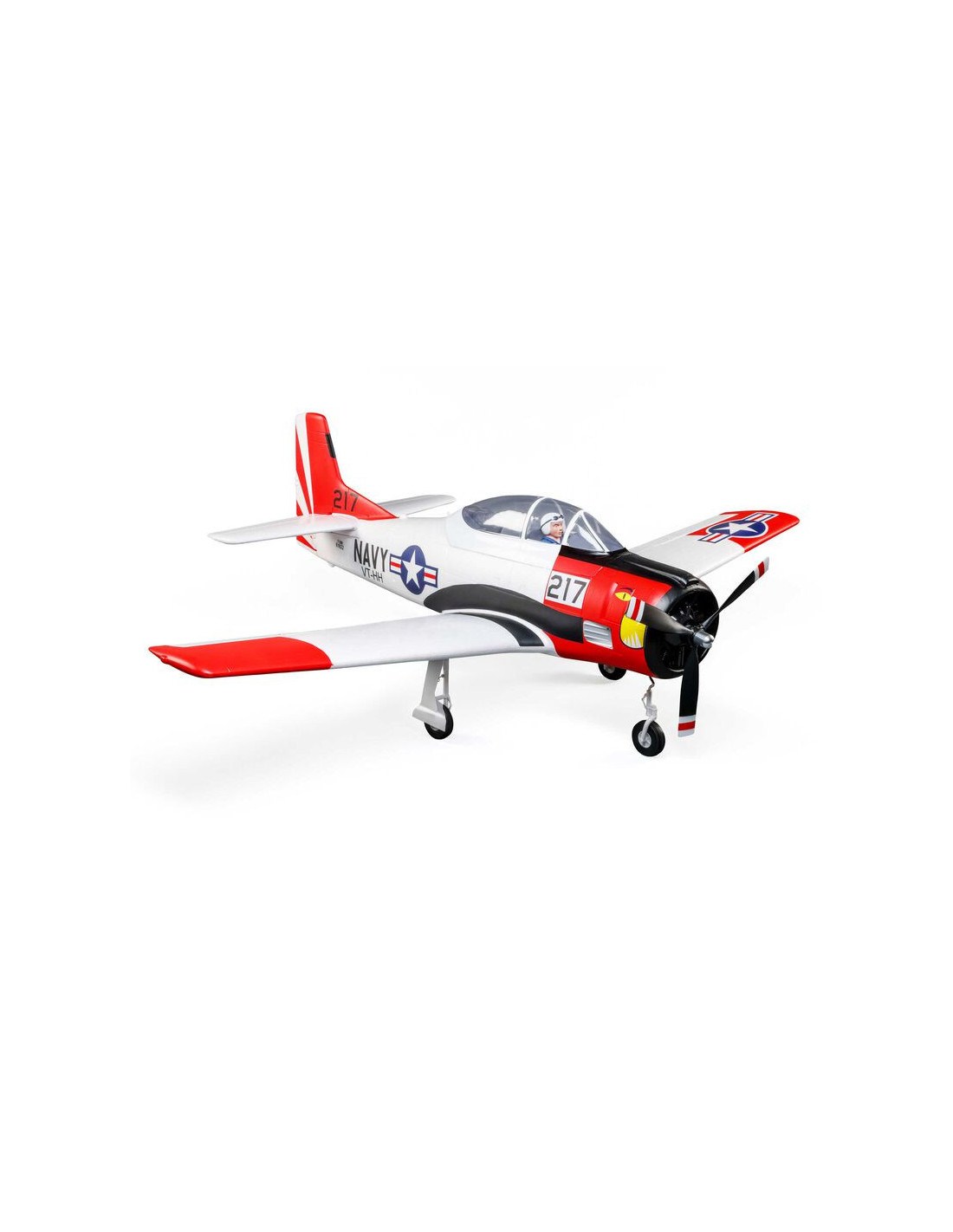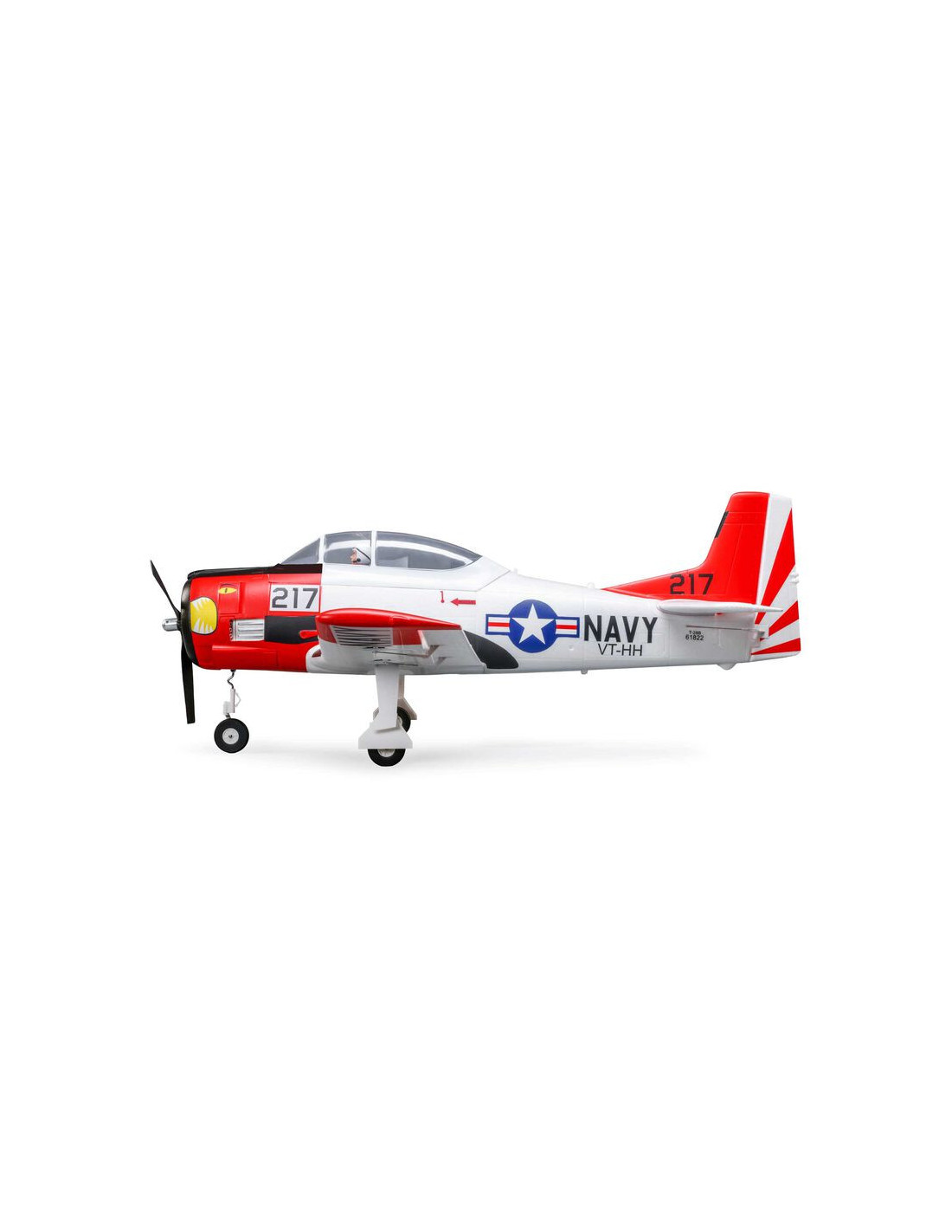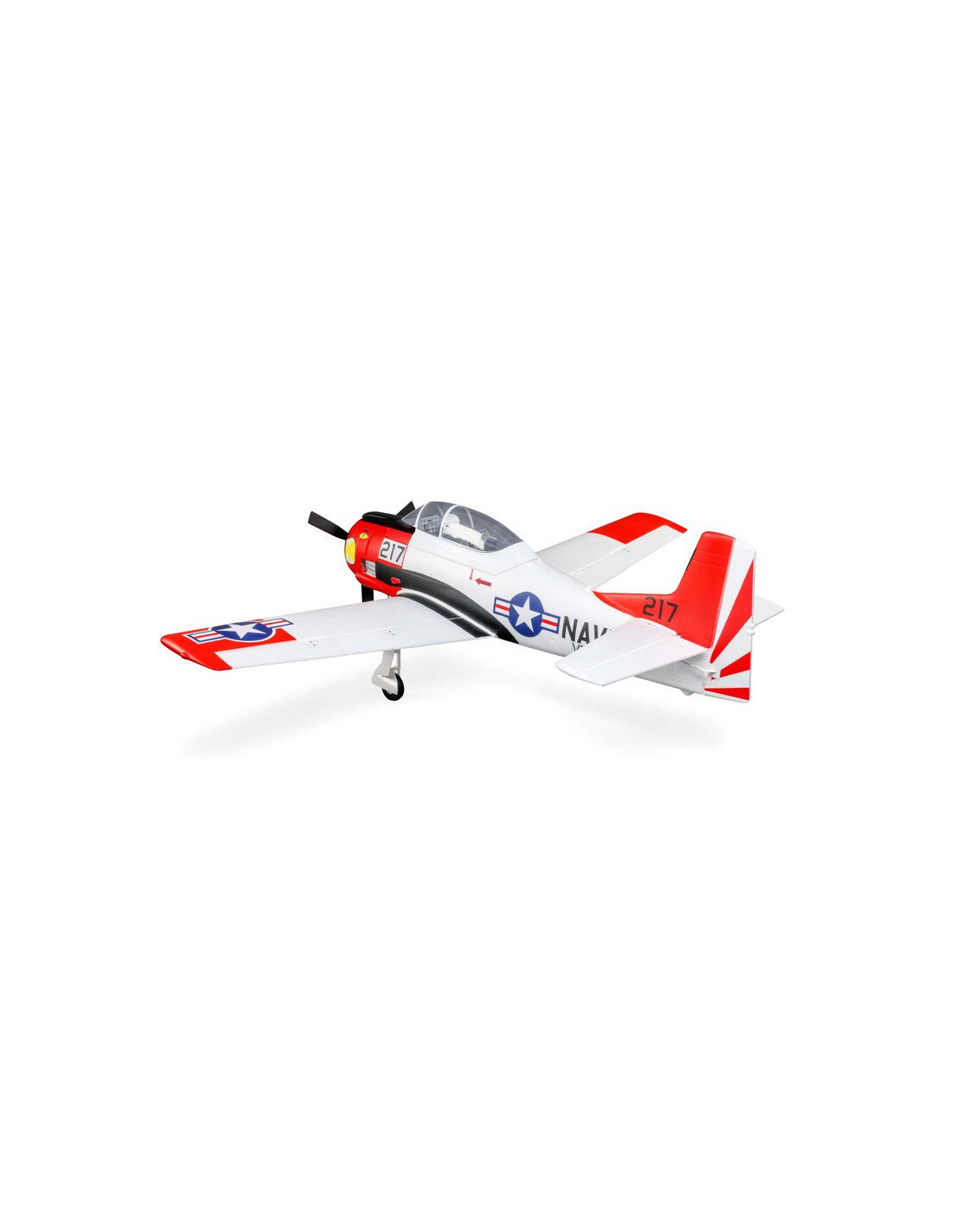 - L'original E-flite® T-28 Trojan 1,2 m a non seulement la finition maquette de l'avion d'entrainement de lUS Navy, mais il est également livré avec des volets fonctionnels et un train rétractable déjà installé.