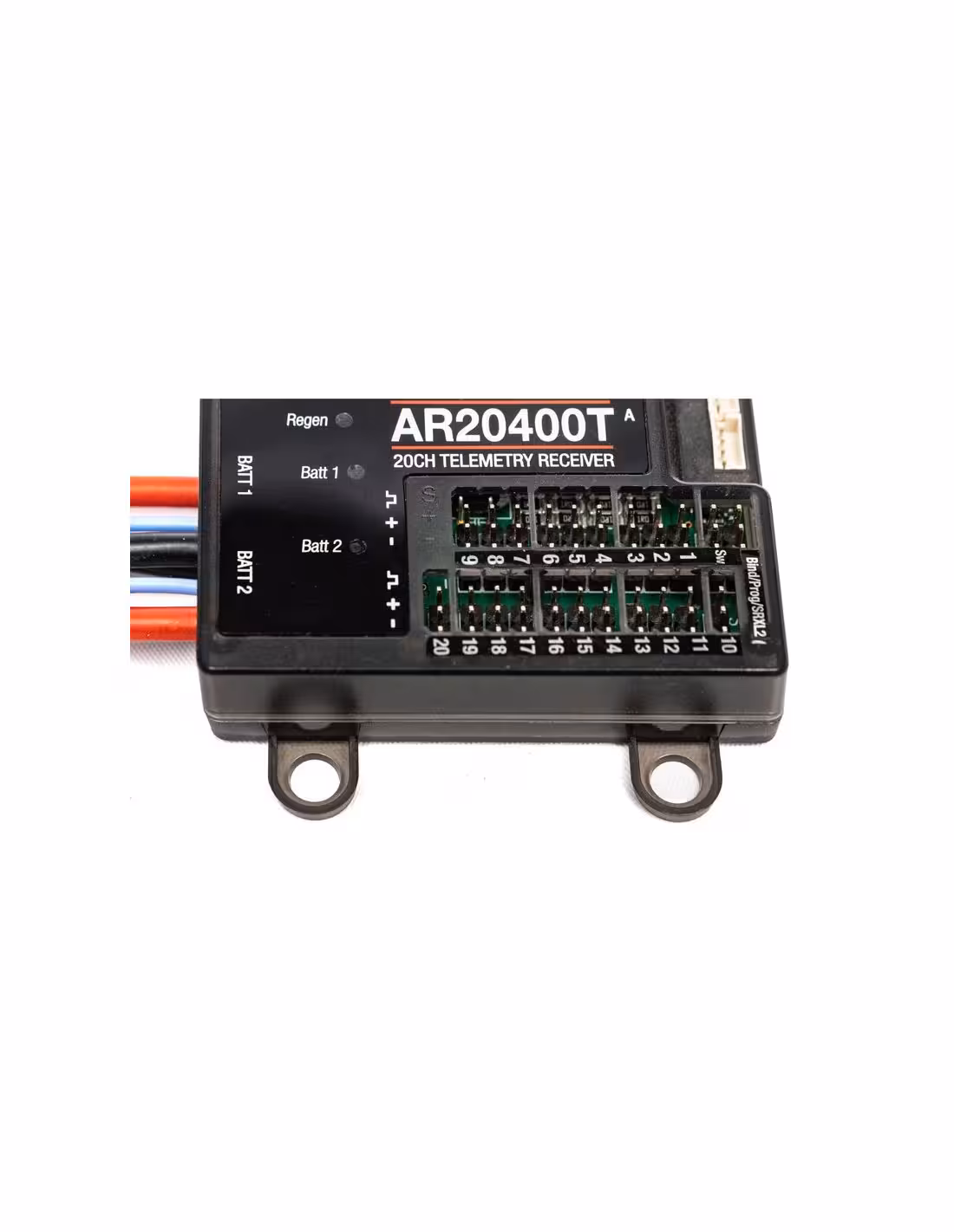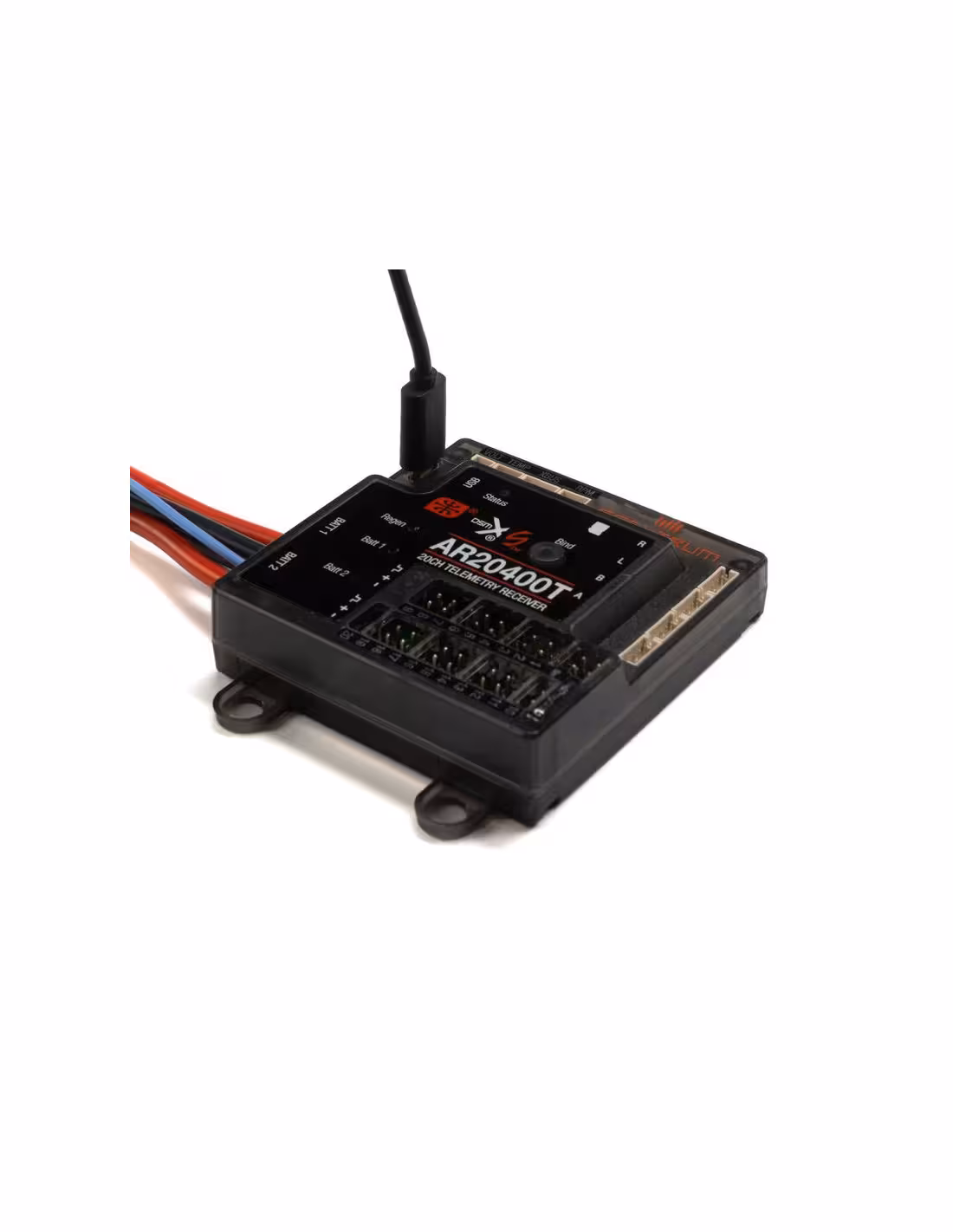 - Le récepteur AR20400T PowerSafe™ est doté de capteurs d'énergie de batterie intégrés, ce qui permet aux pilotes de mieux connaître la charge et le mAh utilisés par les servos, les rétracteurs, les lumières, etc. utilisés par chaque batterie.