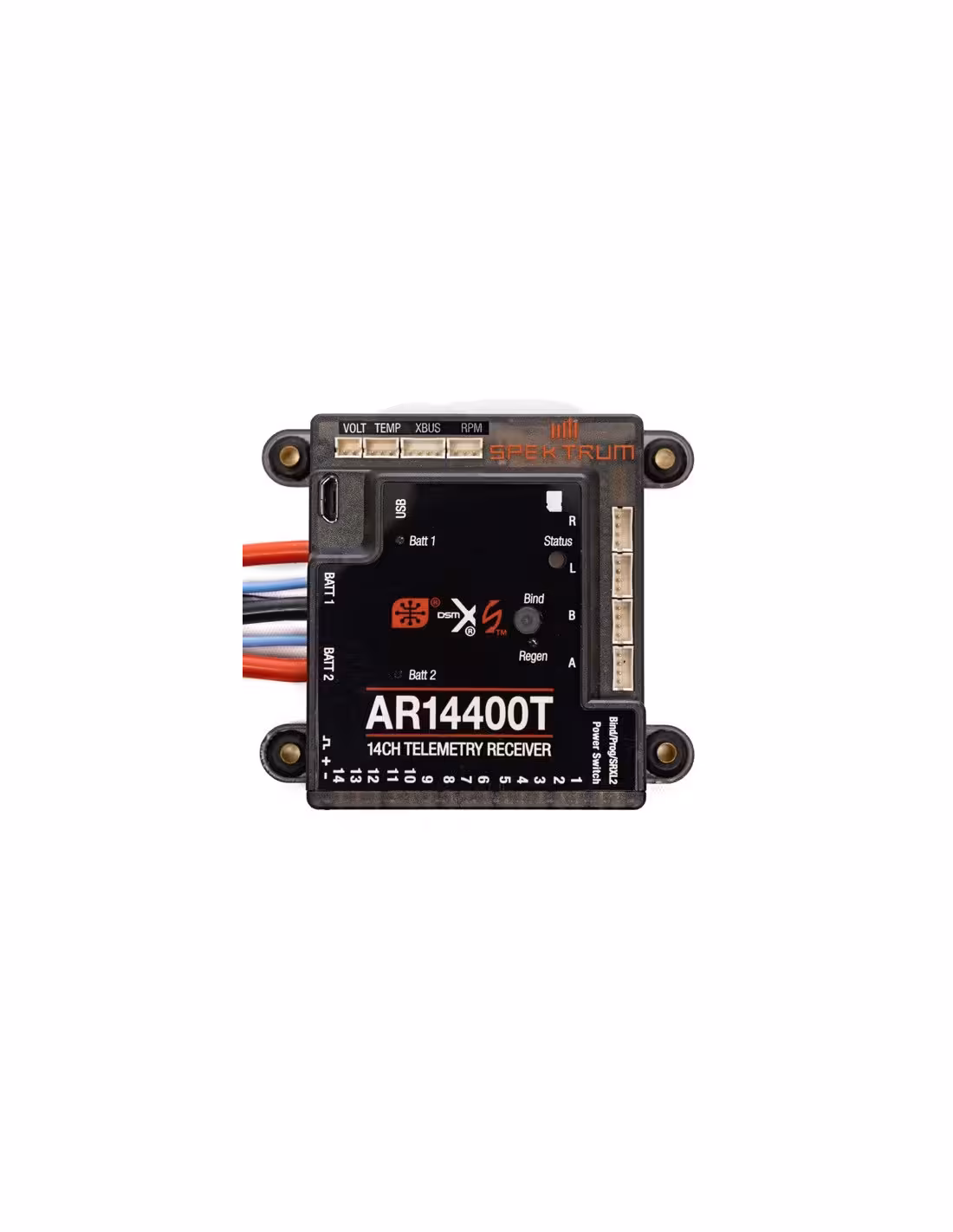 - Si vous disposez d'un émetteur DSMX®/DSM2® capable d'une fréquence d'images de 11 ms, l' AR14400T PowerSafe™ offrira une réponse entrée-sortie rapide comme l'éclair, parfaite pour les applications hautes performances telles que la 3D agressive, l'IMAC et les avions à turbine. Chaque récepteur comprend 3 récepteurs distants SRXL2 qui tirent pleinement parti de la technologie Spektrum MultiLink™. Cette technologie brevetée élimine l'affaiblissement du signal réfléchi et les angles morts de l'antenne qui peuvent affecter tous les systèmes 2,4GHz, contribuant à assurer une connexion solide entre vous et votre avion.