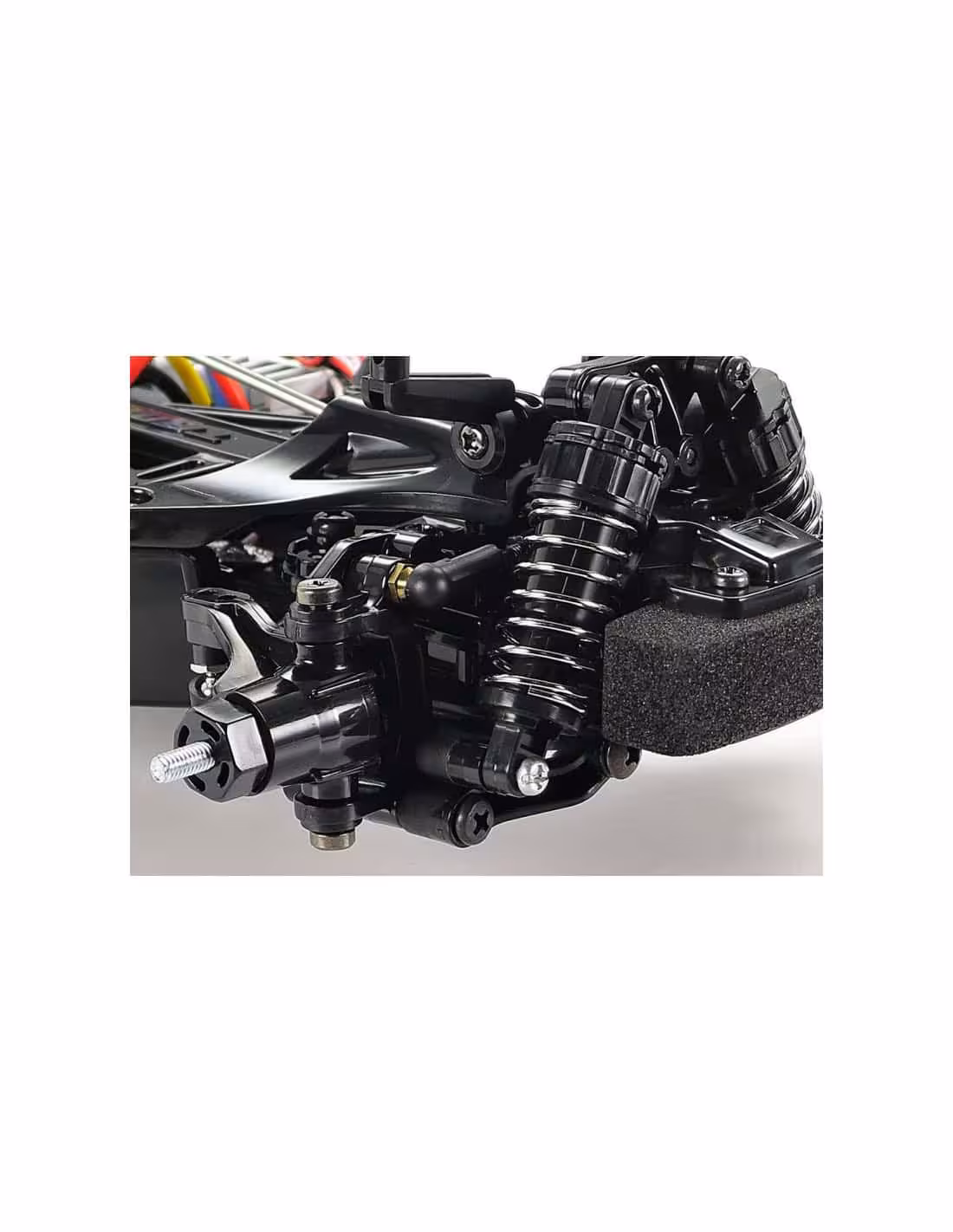 - Le châssis de la M-06 est équipé d'un moteur monté à l'arrière, d'un système de propulsion arrière et d'une batterie montée longitudinalement. L'équipement R/C est placé de chaque côté pour un équilibre optimal et un centre de gravité bas. La suspension à double triangulation aux 4 roues utilise des roues de conception parabolique, équipées de pneus radiaux 60D à l'avant et de pneus super radiaux (durs) 60D à l'arrière. En outre, une tringlerie de direction en 3 parties offre une réponse agile à la conduite.