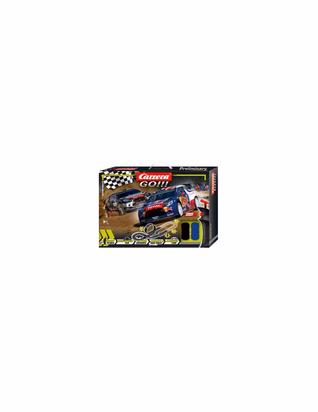 Le circuit Carrera GO !!! long de 4,9 mètres à l'échelle 1:43 te permet dès à présent de te sentir être un vrai pilote de rallye chez toi, à la maison. Les deux voitures de course Citroën DS3 WRC à l'échelle 1:43 ne diffèrent que par leur peinture. Les éléments de voie avec des lignes droites et des sections étroites dans un design de rallye sont d'autres éléments de voie sophistiqués sur la piste. En appuyant sur le bouton turbo du contrôleur, tu pourras vraiment mettre les gaz, surtout dans le looping. En plus du circuit, des deux voitures de circuit et des deux régulateurs de vitesse, le set comprend également un transformateur, un compteur de tours et les accessoires pour le circuit.