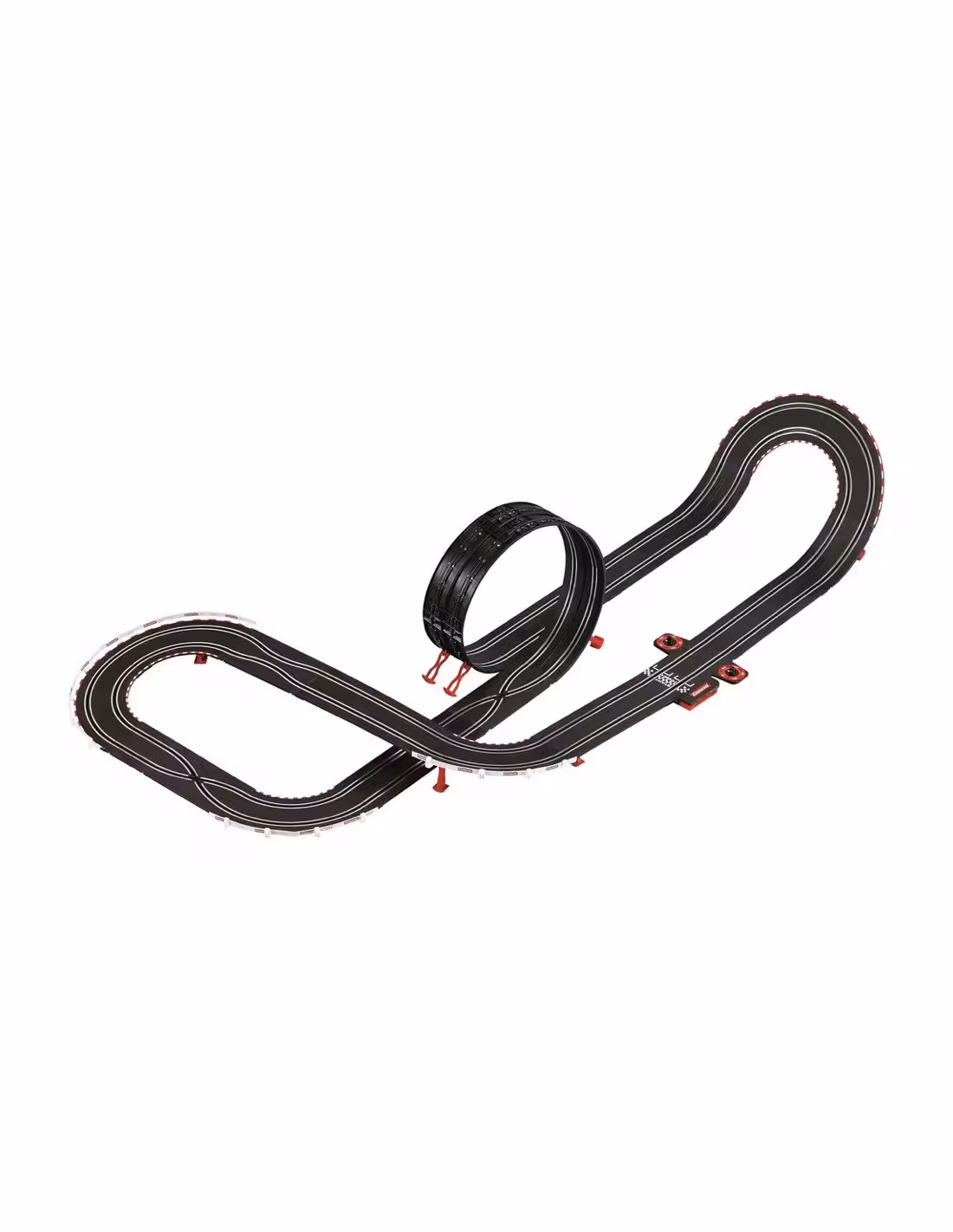 Sur le circuit Carrera, les choses vont bien, car des défis très particuliers comme le looping, le fly-over, le goulot d’étranglement et le changement de voie vous attendent. Ces rails spéciaux vous placent devant des tâches délicates et assurent l’extraportion racing-action, comme dans le vrai sport de course. Sur une trajectoire fière de 6,2 mètres, les bolides de rêve peuvent vraiment accélérer et mettre le PS sur la route. Prouvez vos qualités de champion lors du duel avec vos amis et apportez-vous une vitesse supplémentaire en appuyant sur le bouton « Turbo Speed » sur le régulateur à main. Qui va gagner ?