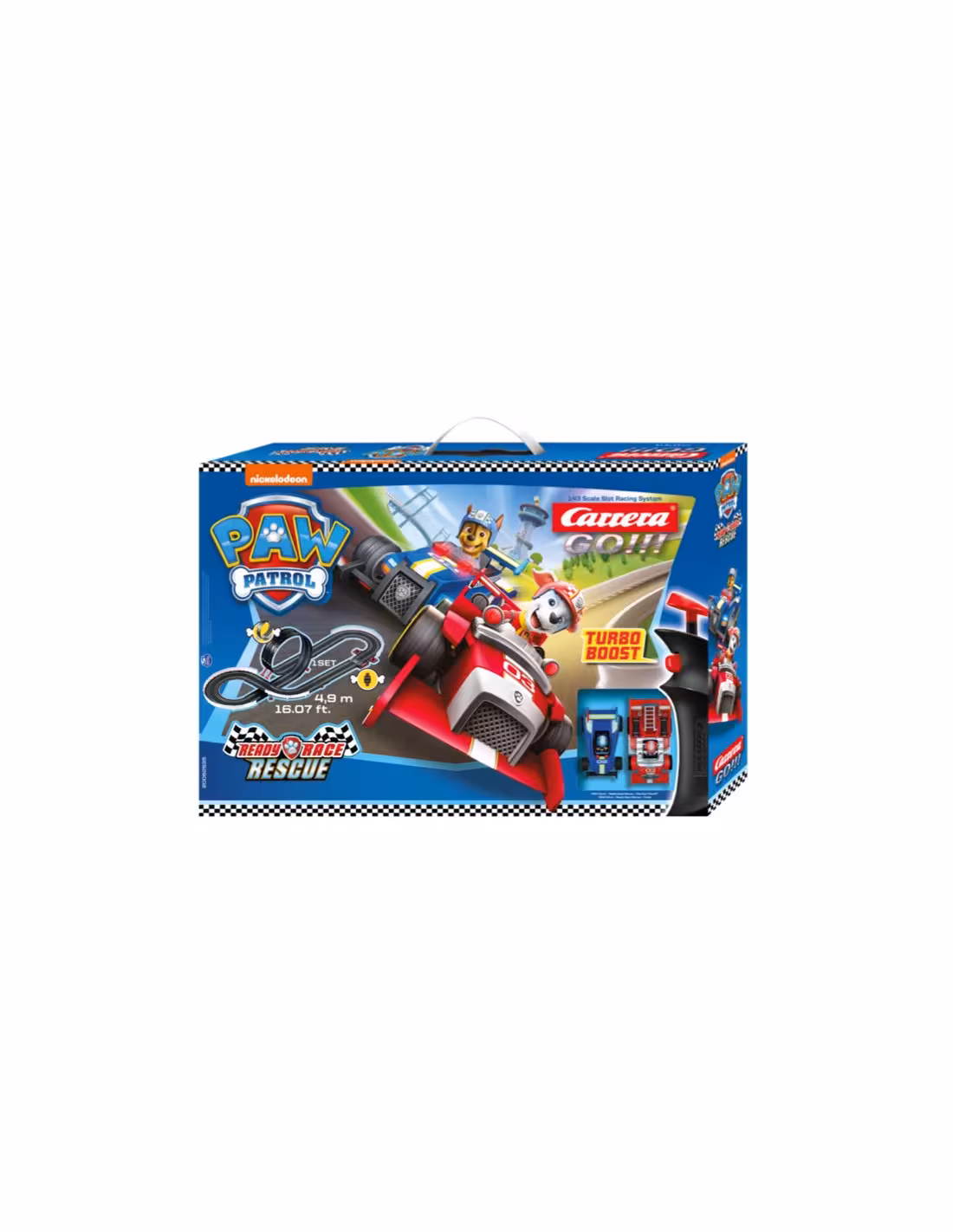 Sur le Carrera GO de 4,9 mètres de long!!! sur le circuit Chase dans sa voiture de police bleue et le Dalmatien Marshall dans le camion de pompiers rouge. Sur les rails bleu ciel, vous décidez des tâches que Chase et Marshall peuvent accomplir dans votre chambre d’enfant.