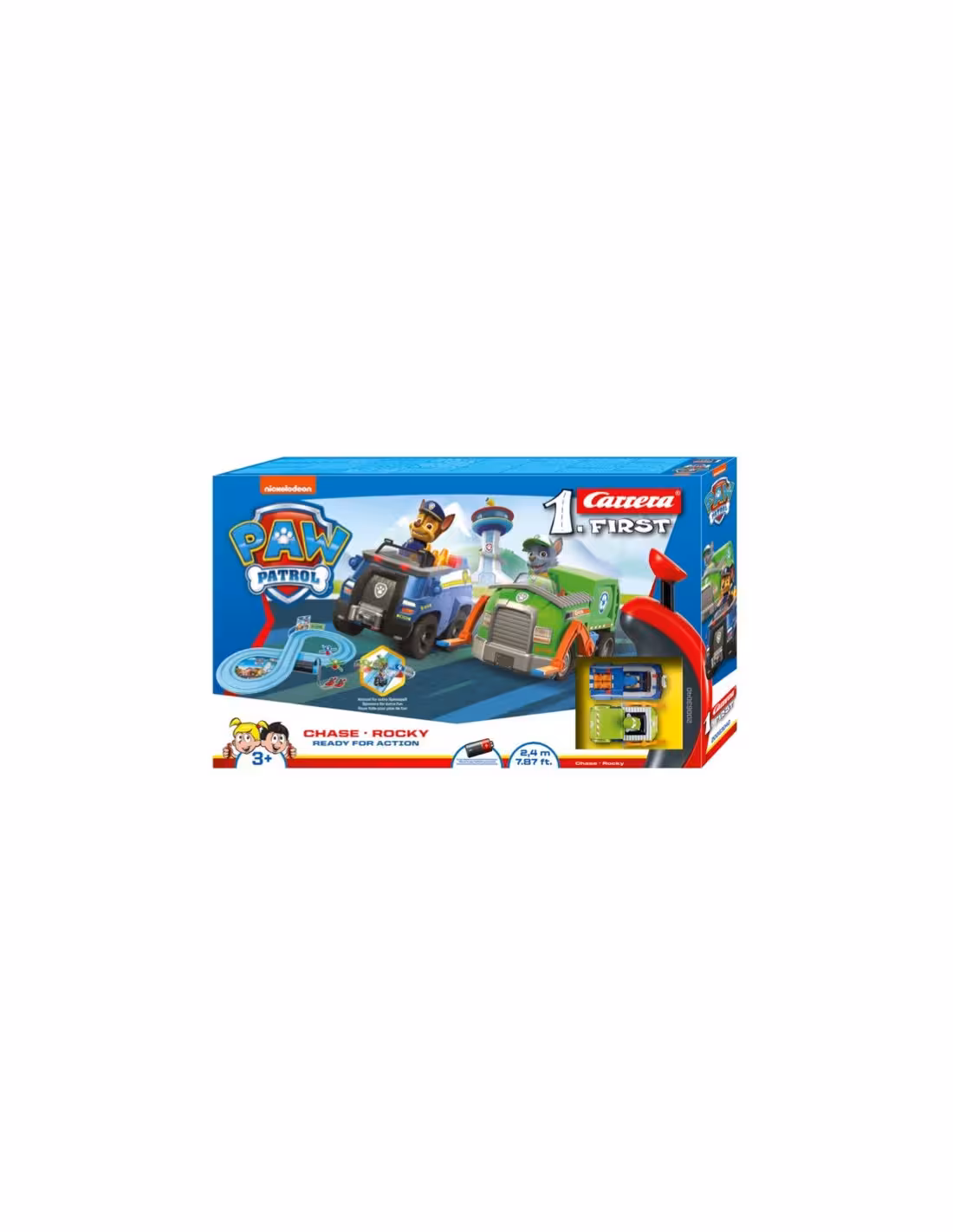 Wuff, wuff ! Chaque petit chien des quadrupèdes populaires de la série PAW Patrol a son propre moyen de déplacement et donc d’autres tâches, talents et compétences. Dans le nouveau kit Carrera FIRST « PAW Patrol - Ready for Action », vous commencez avec les héros de chiens dans des aventures de soirée passionnantes. Avec le chien de police Chase dans sa voiture bleue de police et spécialiste de la réparation Rocky en AR9 éco-recyclage camion, vous vous enchaînez pour de nouvelles expériences. Avec les quadrupèdes, vous assurez la sécurité et la propreté de votre chambre d’enfant.