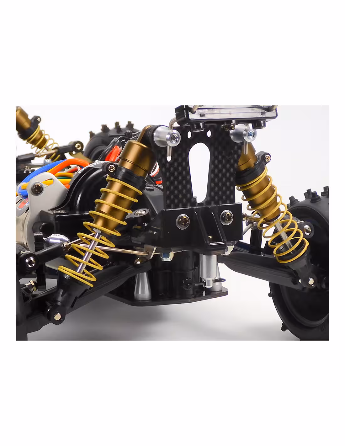 L'Egress, un buggy de course à 4 roues motrices hautes performances, est né en 1989 en améliorant l'Avante, il est l'icône de la voiture RC électrique de Tamiya. Egress Black Edition qui a été mis à jour pour s'adapter à la scène RC moderne tout en conservant la configuration de base telle qu'elle est. l'édition noire présente une couleur noire intrépide avec une coloration blanche et bleue. Et pour correspondre à la couleur de la carrosserie, les amortisseurs avant et arrière et les montants avant ont été changés en alumite de titane foncé,