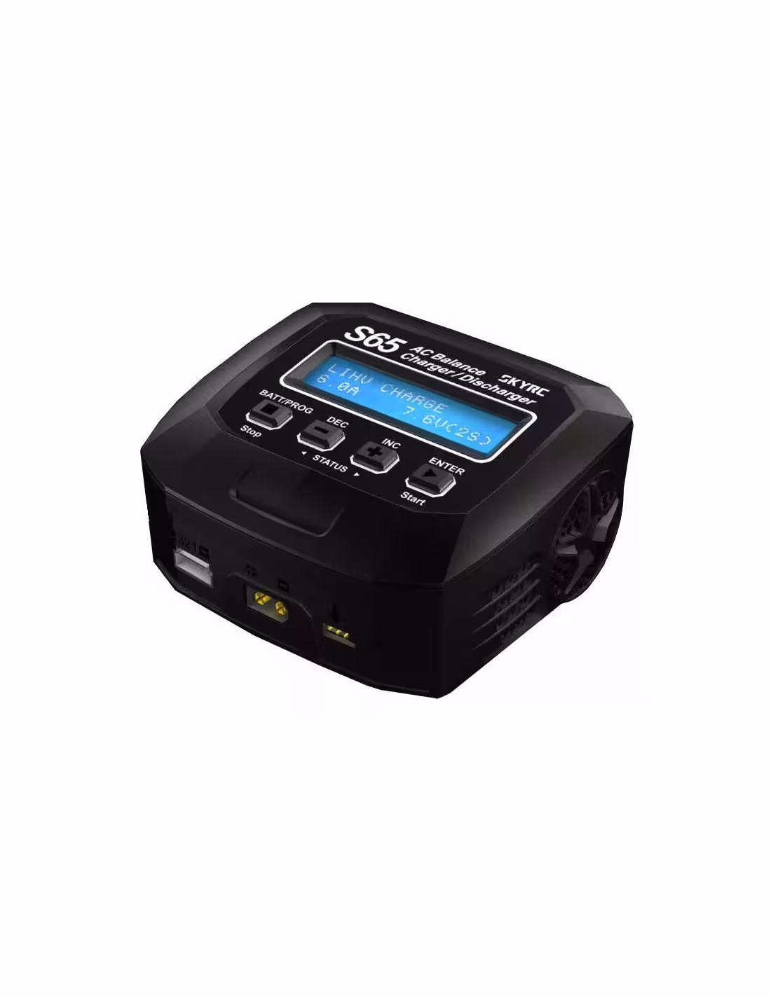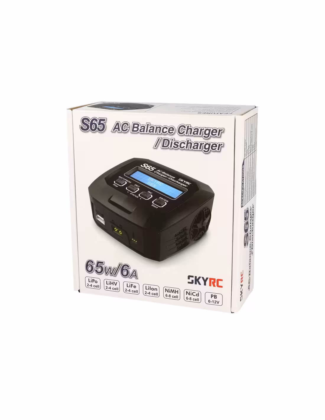 - Le S65 de SKYRC est un chargeur/déchargeur alimenté sur secteur de format compact (117 x 105 x 55 mm). Comme la plupart des chargeurs SKYRC, il dispose du TVC (terminal Voltage Control - Contrôle de la tension de fin de charge), il permet de mesurer les accus et peut être connecté à un PC pour un contrôle depuis l'ordinateur et pour les mises à jour du firmware. Et pour un maximum de sécurité, il dispose de limitation automatique du courant de charge, de protections en température et d'un délai limite de processus.