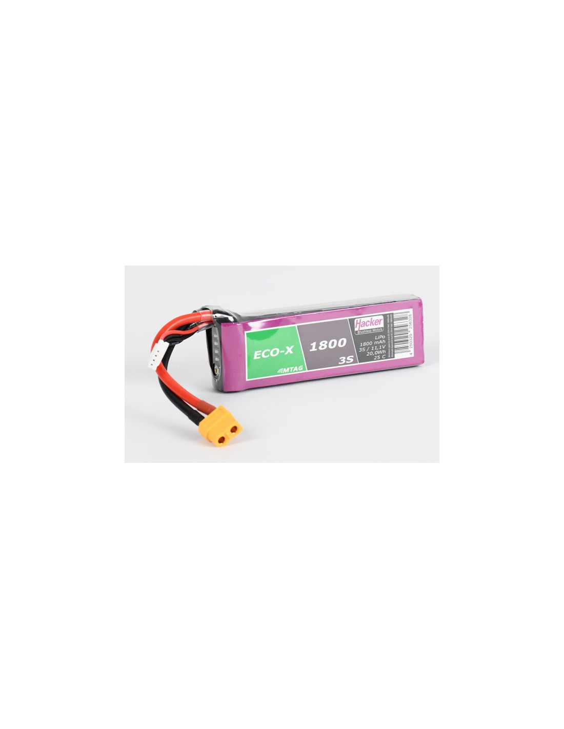 Batterie Hacker lipo 1800 mAh 3 éléments soit 11,1v équipé d'une prise XT60 et d'un testeur intégré qui vous permet une lecture instantané de l'état de charge. Les cellules ECO-X ont maintenant fait leurs preuves des milliers de fois et constituent l'équilibre parfait entre résistance, poids et durée de vie.