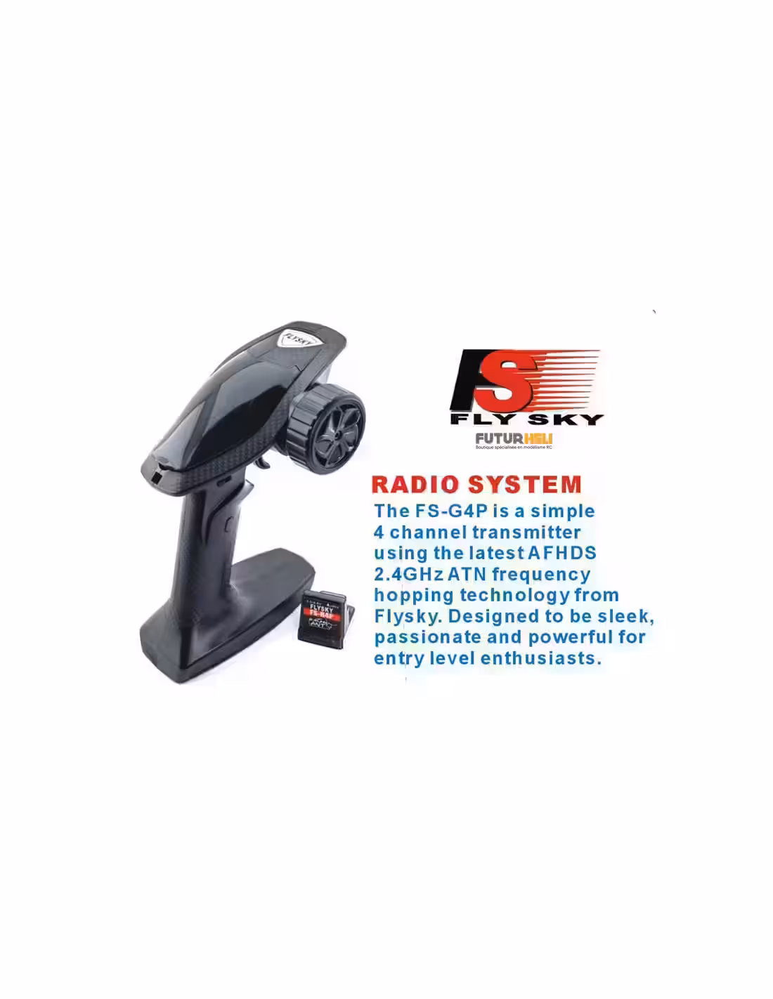 - Composants électroniques étanches et radio FS G4P à 4 canaux 2,4 GHz avec système de sécurité.