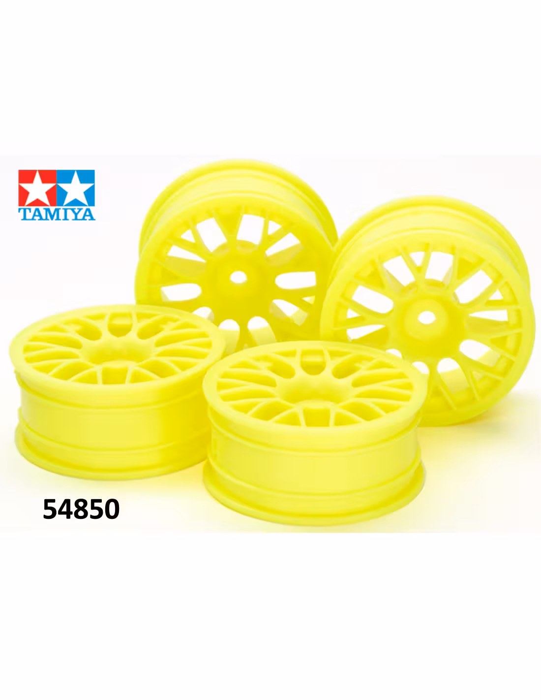Tamiya 54850 . Il s'agit d'une variante de couleur du jeu de roues a rayon Type BBS classique de Tamiya pour les modèles de kits R/C de voitures de tourisme et de sport. Le jeu de roues d'origine est en blanc, tandis que celles-ci sont dans une nuance de jaune vif.