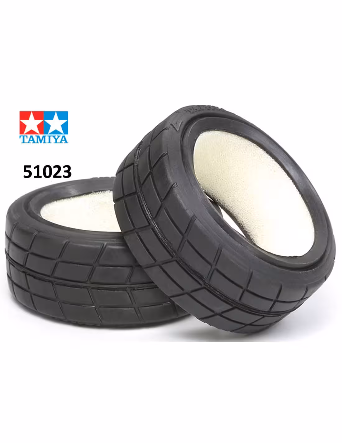 Tamiya 51023 .Il s'agit de pneus radiaux de remplacement utilisés sur de nombreux kits de voitures routières de Tamiya. Ils utilisent une bande de roulement fendue pour une meilleure adhérence. Ils sont fabriqués en vinyle pour une longue durée de vie.