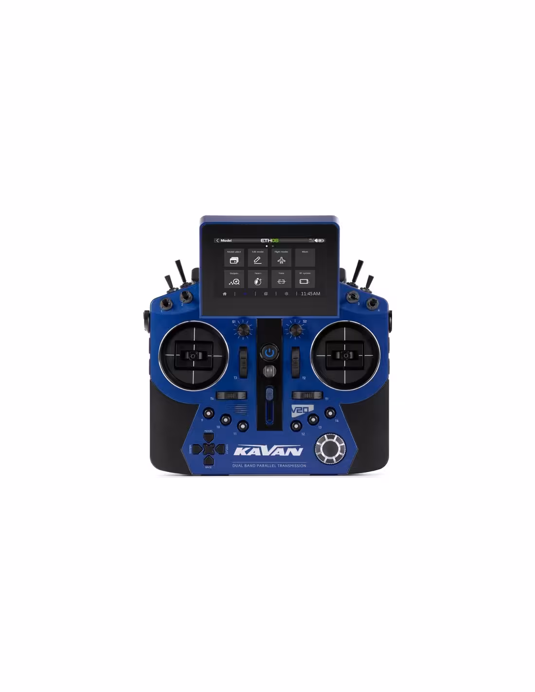 La radio KAVAN V20 est un système avancé à 24 canaux, utilisant une double fréquence de transmission de 2,4 GHz avec prise en charge totale de la télémétrie. Sa réponse rapide de 4 ms sur des distances considérables, associée aux options ACCST D16 ou ACCESS, en fait un choix polyvalent pour divers récepteurs KAVAN ou FrSky. Que ce soit pour des avions, hélicoptères, multicoptères, navires ou modèles terrestres, le V20 convient aux pilotes avancés et sportifs.La configuration facile est facilitée par le système d'exploitation ETHOS™, offrant un écran tactile couleur pour ajuster les nombreuses fonctions et mixages disponibles. Les manches montés sur 10 roulements à billes assurent une précision élevée avec des capteurs Hall, offrant une résolution supérieure sans usure mécanique.