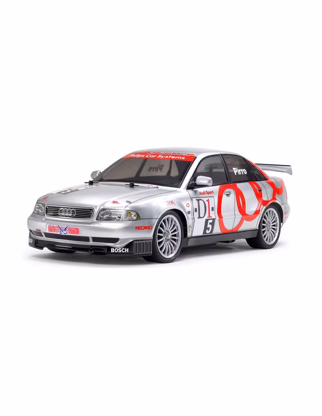Ce modèle réduit de voiture radiocommandée Tamiya reproduit fidèlement une Audi A4 Quattro Touring car emblématique telle qu'elle était engagée en compétition en 1997. À la fin des années 1990, les équipes soutenues par les constructeurs automobiles dominaient largement les championnats de voitures de tourisme à travers le monde. Parmi les plus en vue se trouvait Audi, qui dépensait sans compter pour atteindre les sommets des podiums. Partant de la base de l'A4 Quattro, Audi a apporté d'importantes modifications à la voiture pour en faire une championne en piste. De plus, Audi s'attachait à recruter les meilleurs pilotes internationaux afin de valoriser au mieux son œuvre.