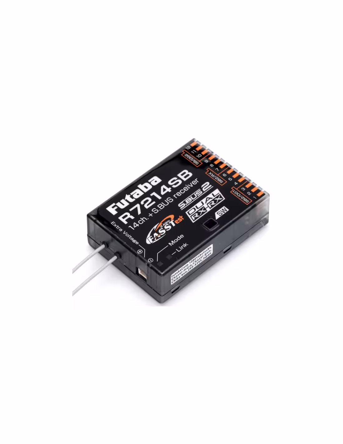 Récepteur Futaba R7214SB Sbus 2 modulation FASSTest 2,4 GHZ . 14 voies . Dimensions 50,2x37x15,9mm poids 19g .Voltage e 3.5 à 8.4 v