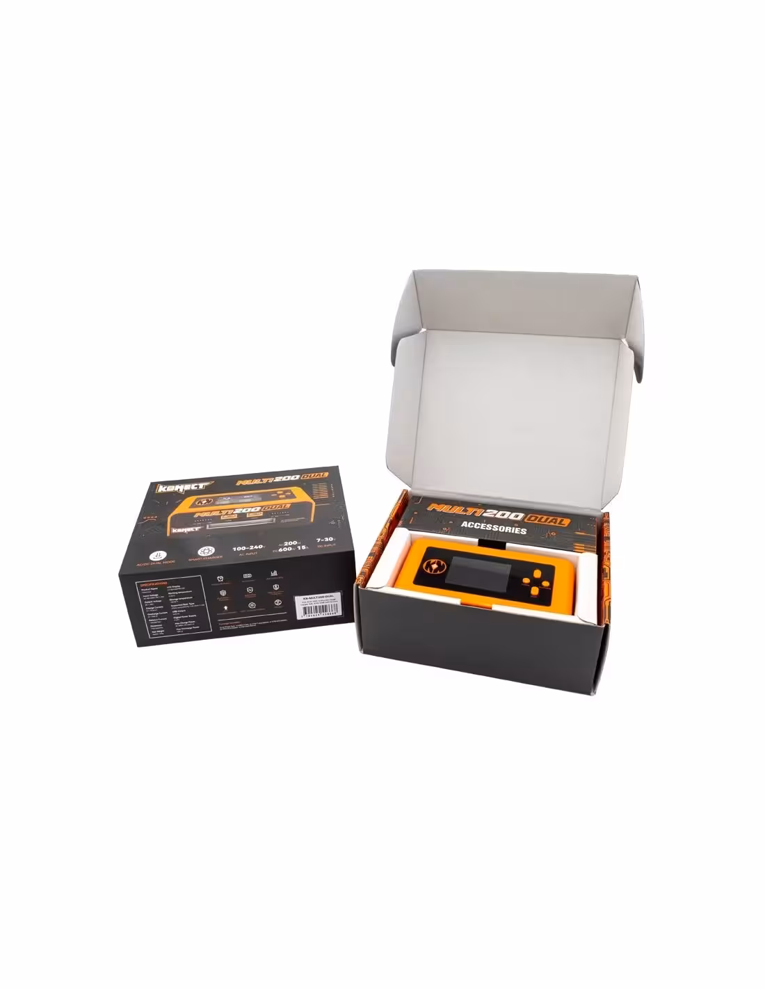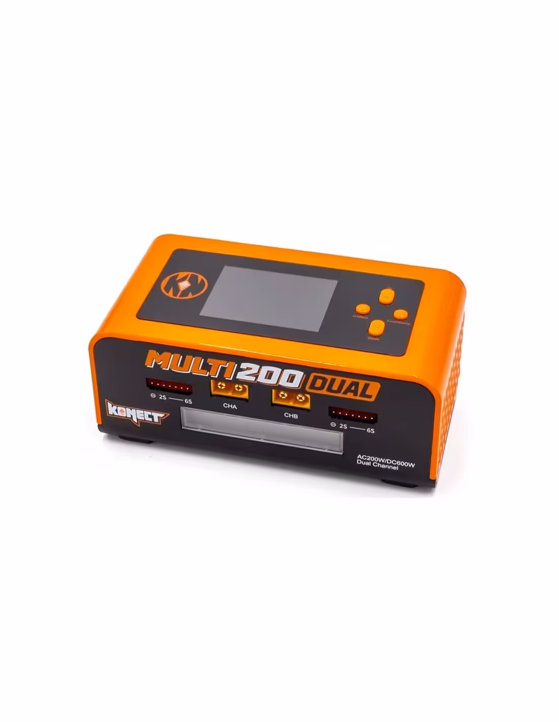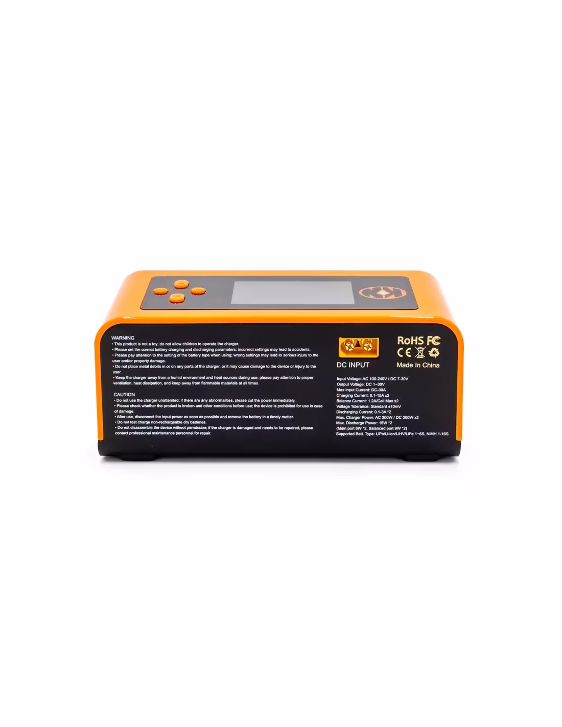 Il peut être branché sur le secteur (230V) ou sur une alimentation dédiée. La puissance totale de ce chargeur est de 300W sur une alimentation de 7 à 30V ou de 200W sur secteur avec une répartition intelligente de la charge entre les 2 canaux. Ce chargeur double est compact et son fonctionnement est très intuitif. Son écran de 2.4 pouces en couleur (résolution de 320x240) est divisé en 2 ce qui facilite la visualisation et le paramétrage des 2 canaux. Le courant de charge peut être réglé de 0.1 à 15A. Enfin, il est possible d’alimenter ce chargeur via un accu ce qui permet d’être autonome lorsque vous êtes sur un terrain qui ne propose pas d’alimentation.Ce chargeur peut jouer le rôle d’une alimentation en délivrant du courant à des accessoires (chauffe pneus, fer à souder . La tension de sortie est réglable entre 5 et 29V. Sur le plan pratique, ce chargeur possède aussi une prise USB.