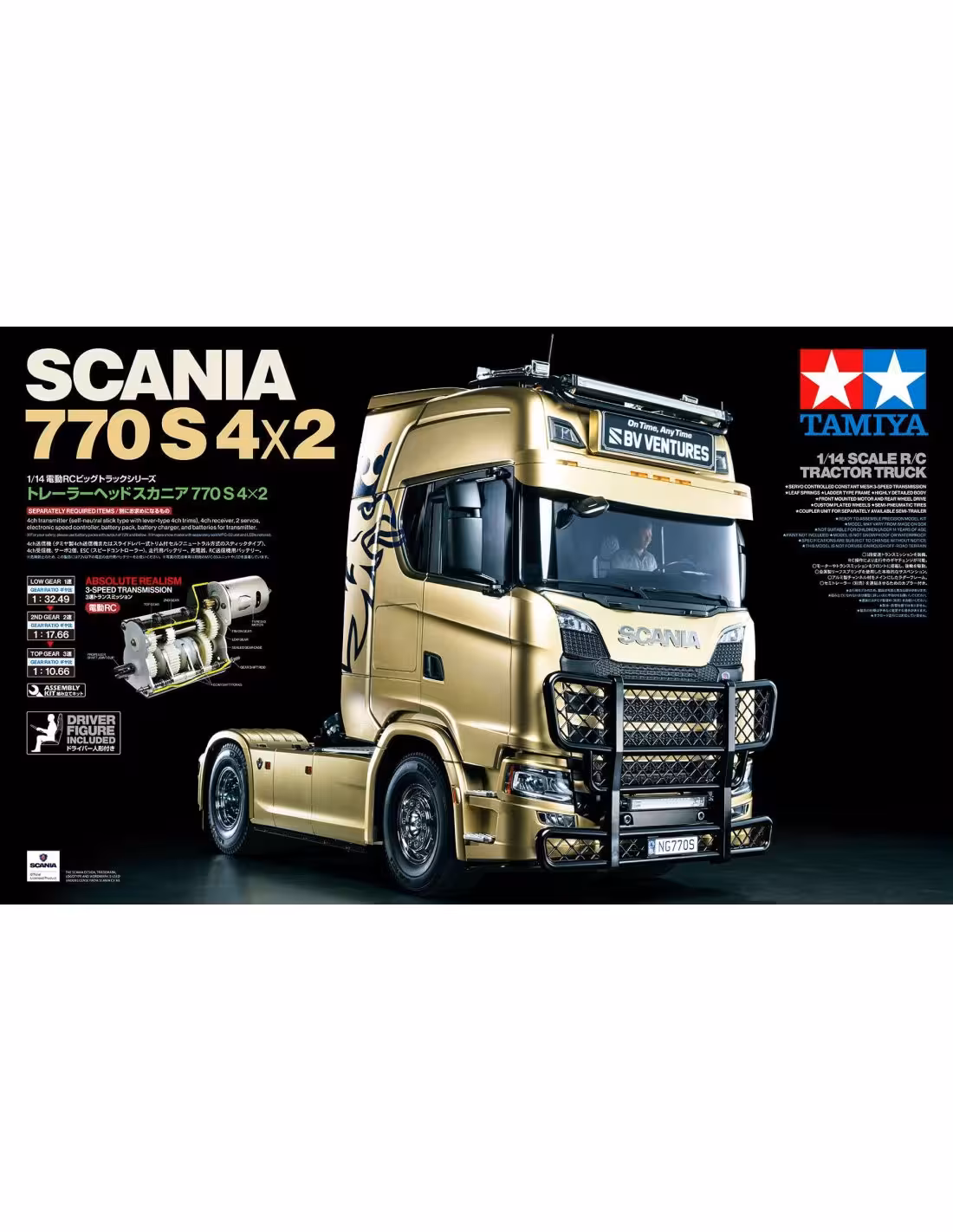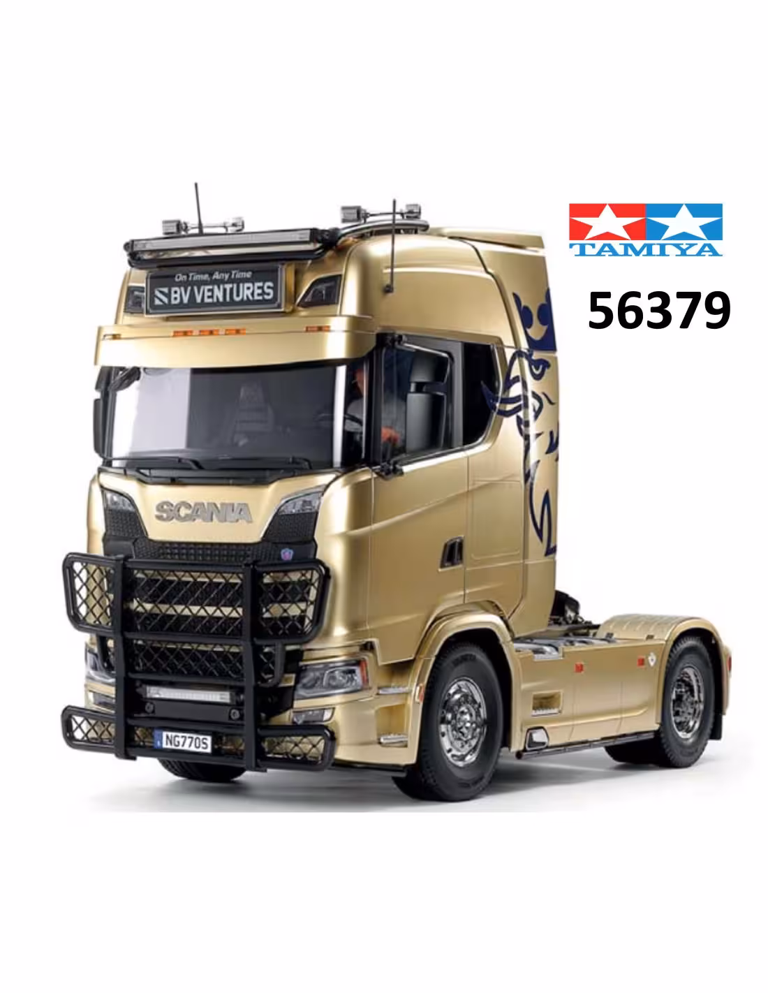 Tamiya 56379 .Après le 770 S 6x4 (56368) et le 770 S 8x4/4 (56371), Tamiya ajoute à sa gamme de camions RC 1/14 le Scania 770 S 4x2. Ce tracteur lourd de semi-remorque deux essieux équipé d’un moteur V8 turbo de 16,4 litres d’une puissance de 770ch a rejoint en 2020 la série S haut de gamme du constructeur suédois. Ce kit RC reproduisant fi dèlement la carrosserie de l’original inclut également des pièces optionnelles pour recréer une version personnalisée comme celles en vogue en Europe.