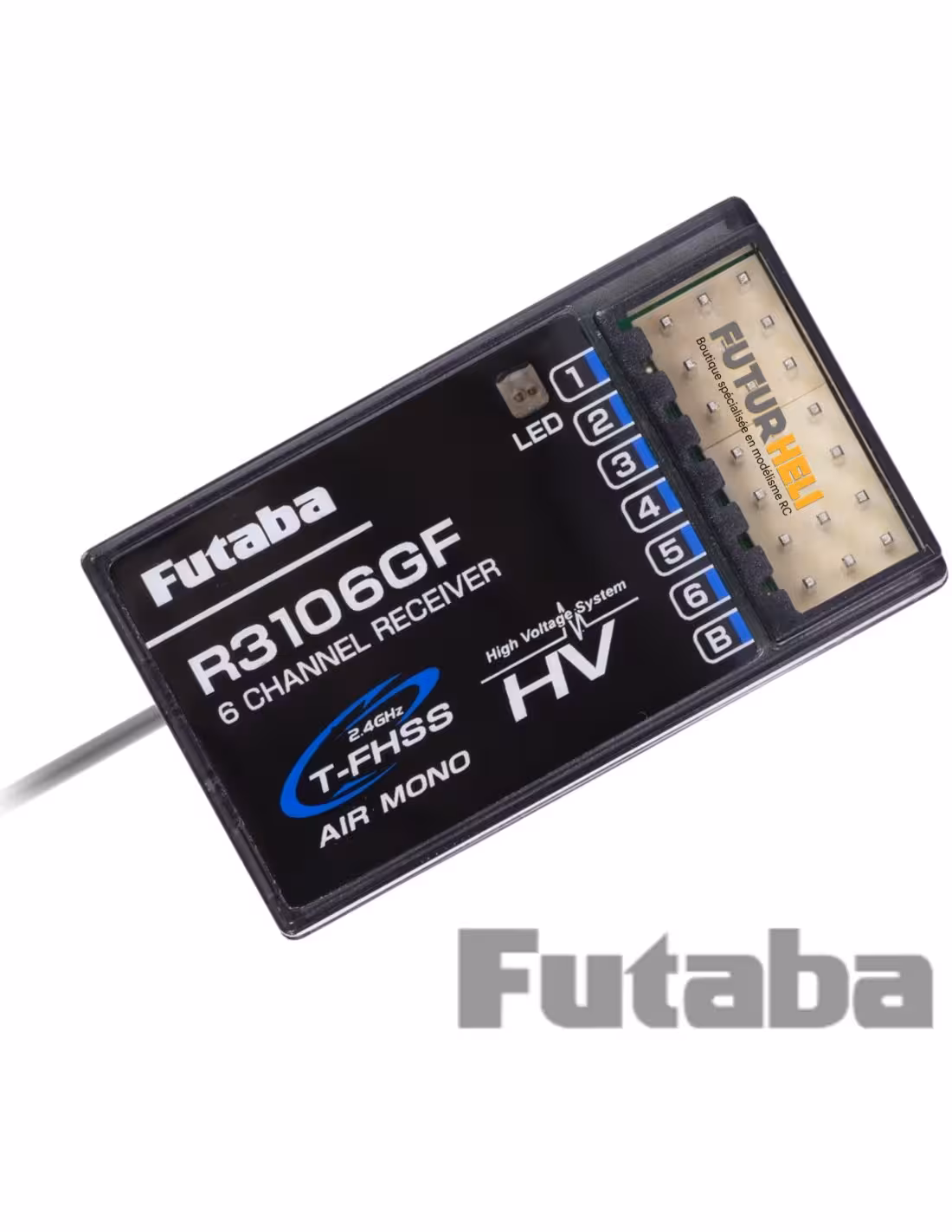 Récepteur R3106GH de la gamme futaba en 6 voies modulation T-FHSS ( sans télémétrie ) . Alimentation de 4,8v à 7,4v . Dimensions 43,1x25x8,8mm poids 7,8g .