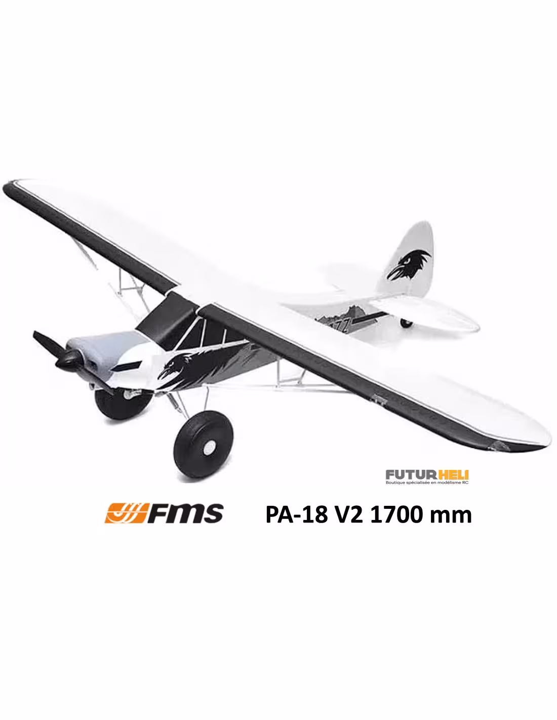 Nouveau PA-18 FMS version 2 envergue 1700 mm .Le fuselage en deux parties réduit le packaging de 30%, améliorant largement la facilité de transport pour les pilotes. Version PNP il faudra ajouter votre radio et votre batterie . Il possède de superbes qualités de vol, tout en offrant plus de puissance et une plus grande envergure que ces petit frère le 1300 et d'impressionnantes performances de décollage et atterrissage court (STOL), permettant de l'utiliser pratiquement n'importe-où . Pour le pilote qui cherche une véritable expérience du "bush flying", le Piper PA-18 Super Cub peut aussi être équipé de flotteurs (Vendus à part).