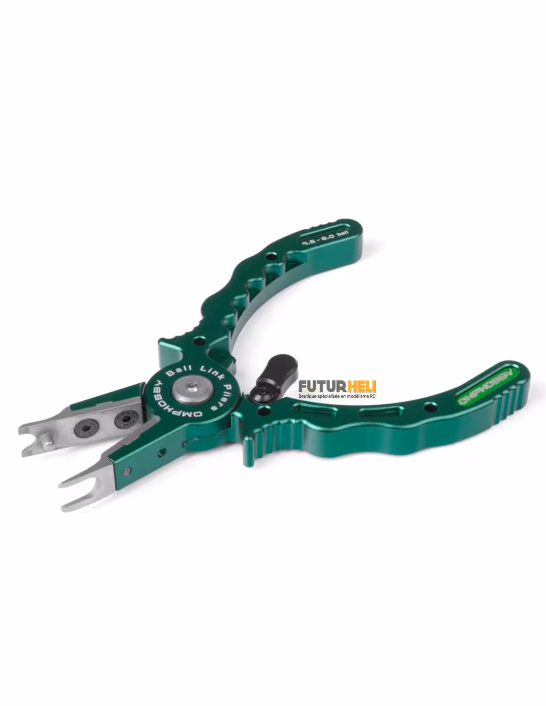 Démontez facilement les chapes de votre helico avec cette pince en alu de la marque OMPHOBBY . En aluminium de couleur verte .