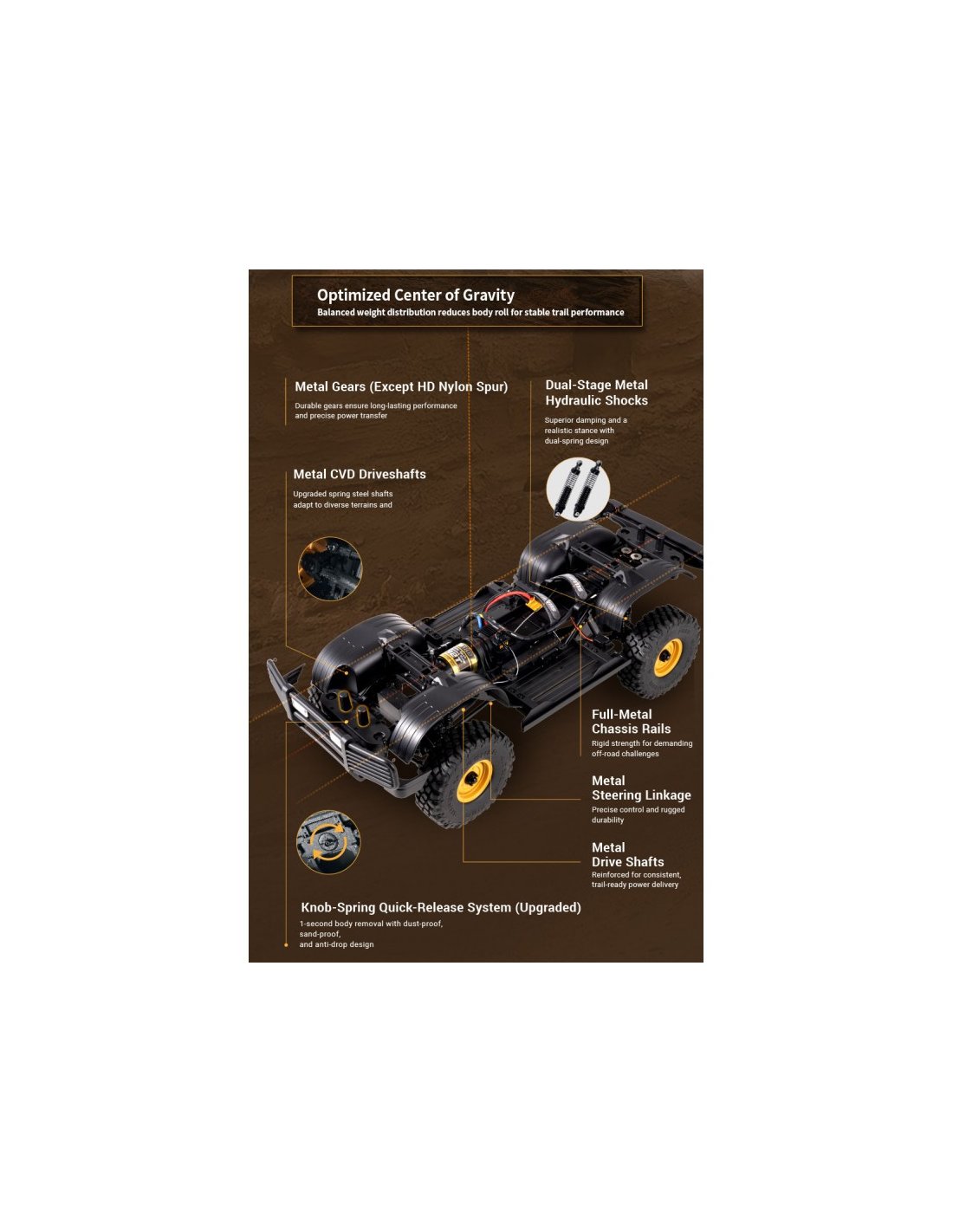 Chaque modèle regorge de détails fidèles à l'échelle, notamment des rétroviseurs latéraux, des snorkels, des projecteurs fonctionnels et un intérieur entièrement détaillé. La carrosserie en plastique souple PC durable est équipée de phares, de feux de recul et de garde-boue préinstallés, garantissant à la fois réalisme et protection robuste .