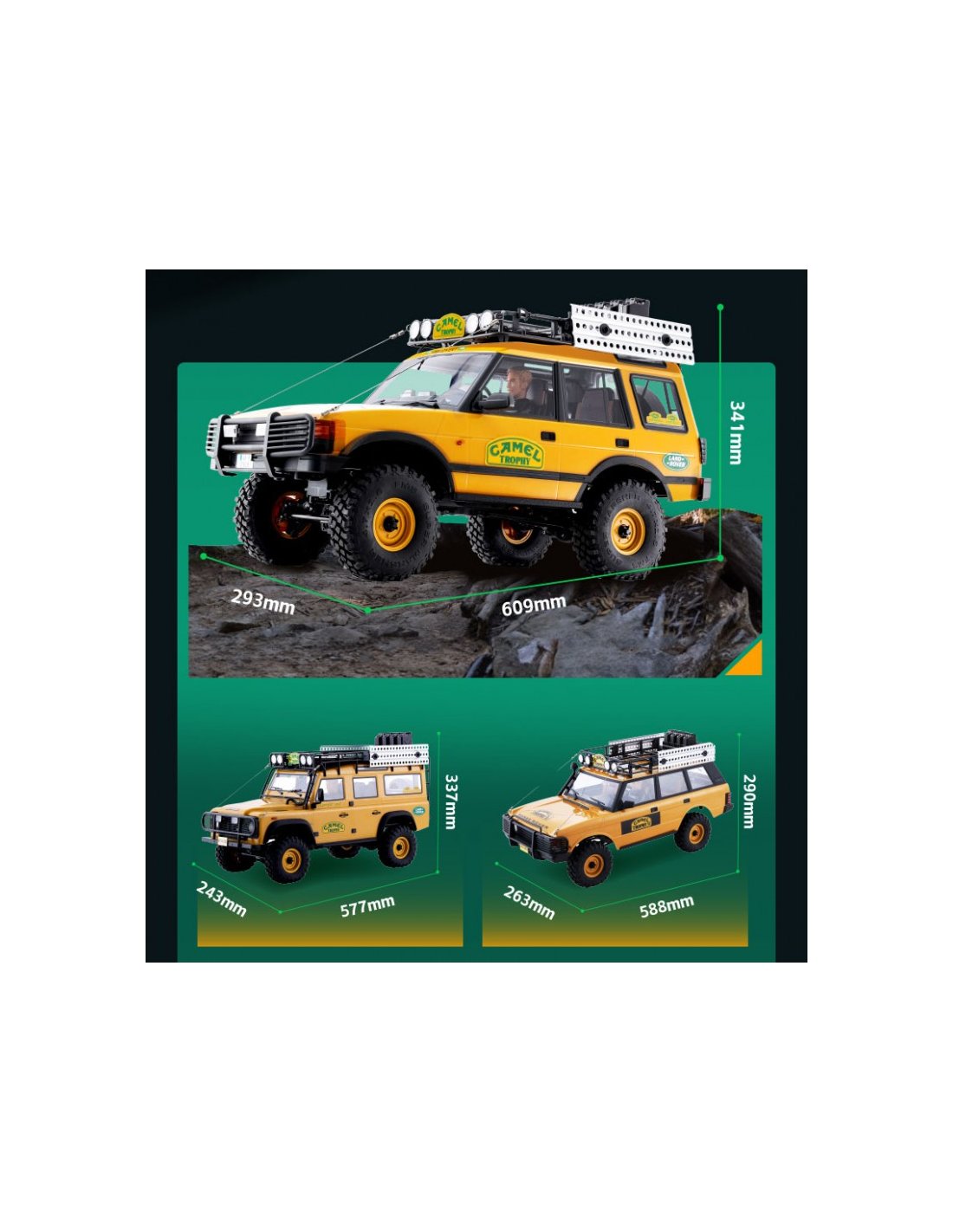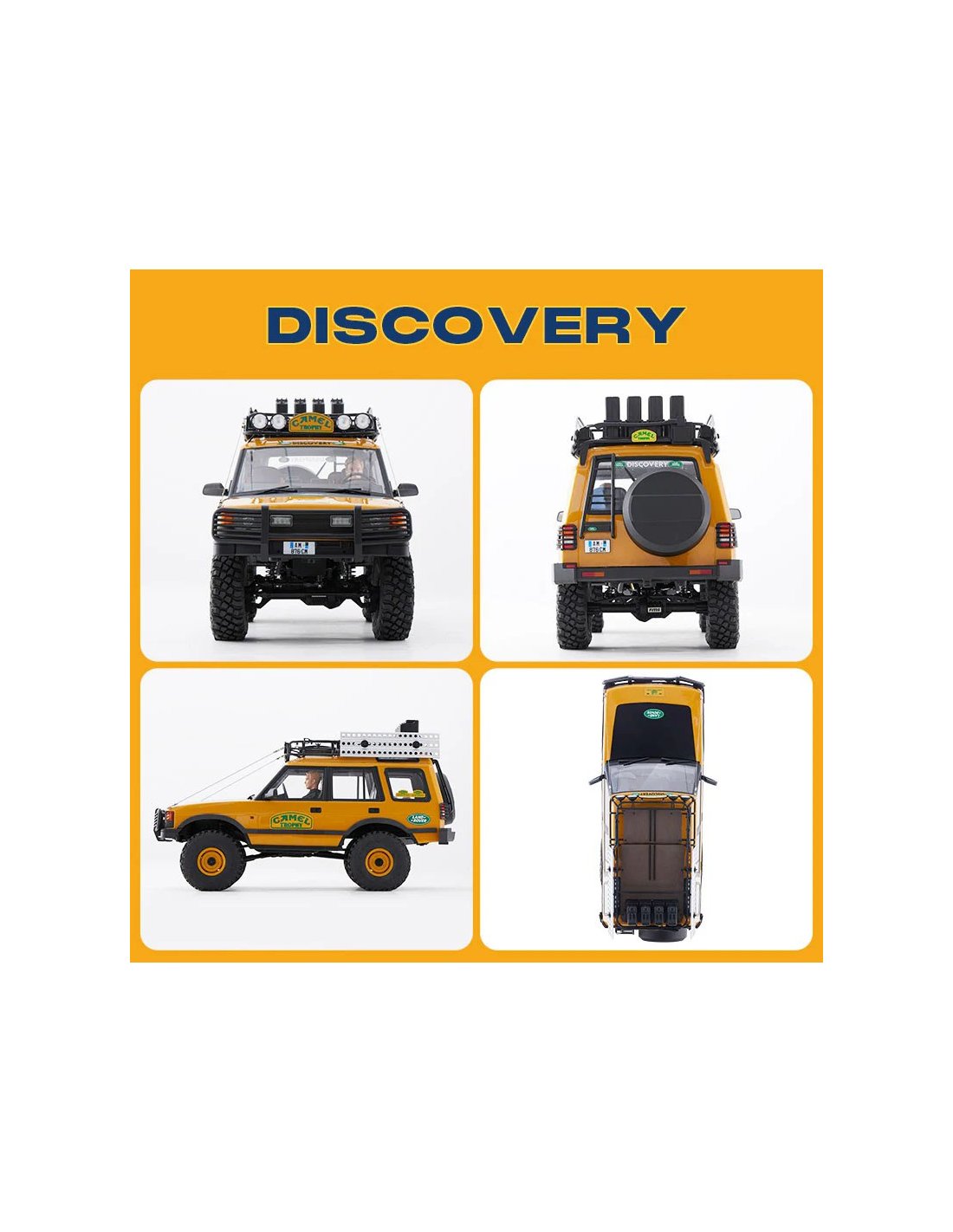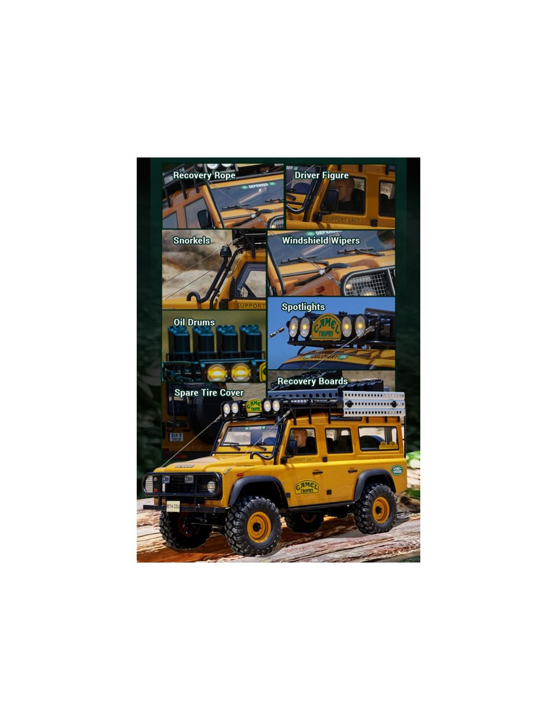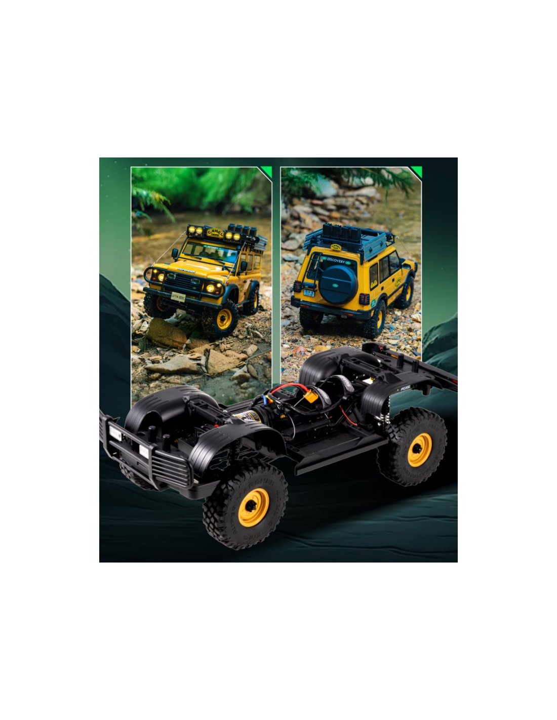 Futurheli et FMS sont fiers de présenter la série Land Rover Camel Trophy à l'échelle 1/10, comprenant des modèles sous licence officielle des Defender, Range Rover et Discovery. Construits sur le châssis FCX10 éprouvé, ces crawlers RC offrent une durabilité et des performances testées sur les sentiers, dignes du nom Land Rover. Chaque modèle regorge de détails fidèles à l'échelle, notamment des rétroviseurs latéraux, des snorkels, des projecteurs fonctionnels et un intérieur entièrement détaillé . La carrosserie en plastique souple PC durable est équipée de phares, de feux de recul et de garde-boue préinstallés, garantissant à la fois réalisme et protection robuste .