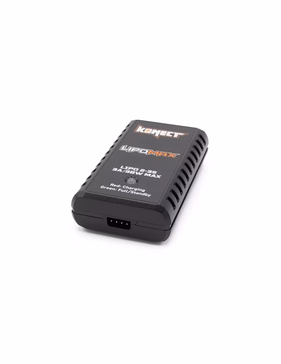 Chargeur compact Lipomax de chez Konect, utilisable partout grâce à son alimentation en USB il vous permettra des charger vos batteries en 2 ou 3 éléments lipo . Nous vous conseillons pour une charge sure et rapide un adaptateur 220 USb de qualité