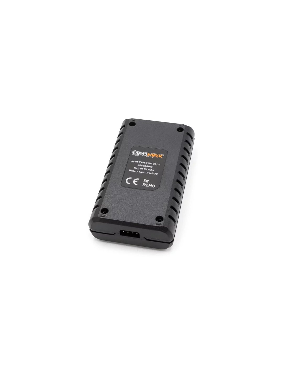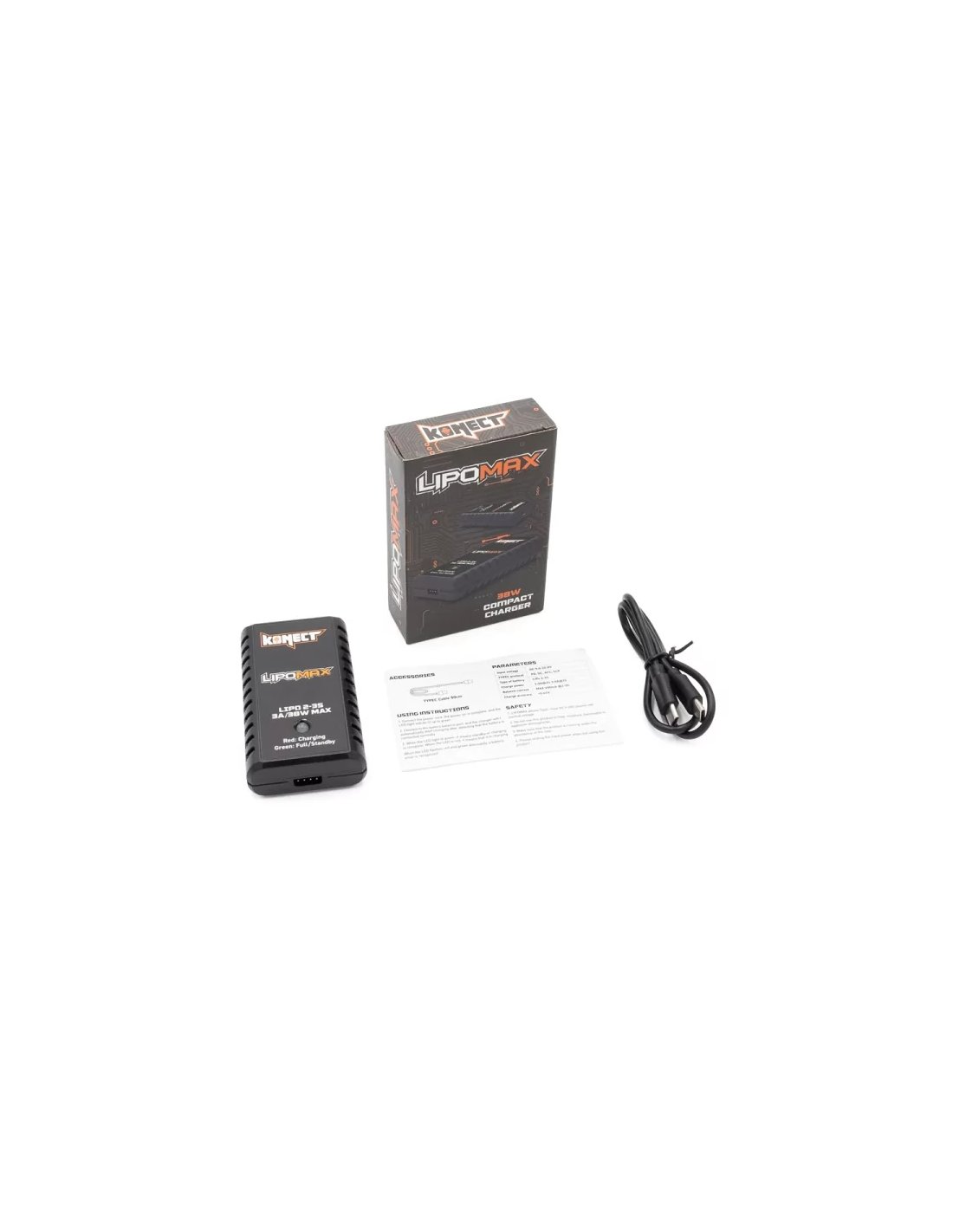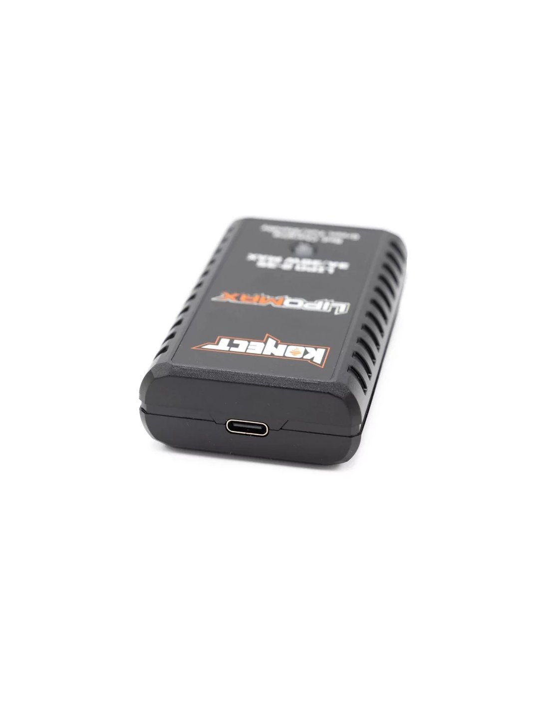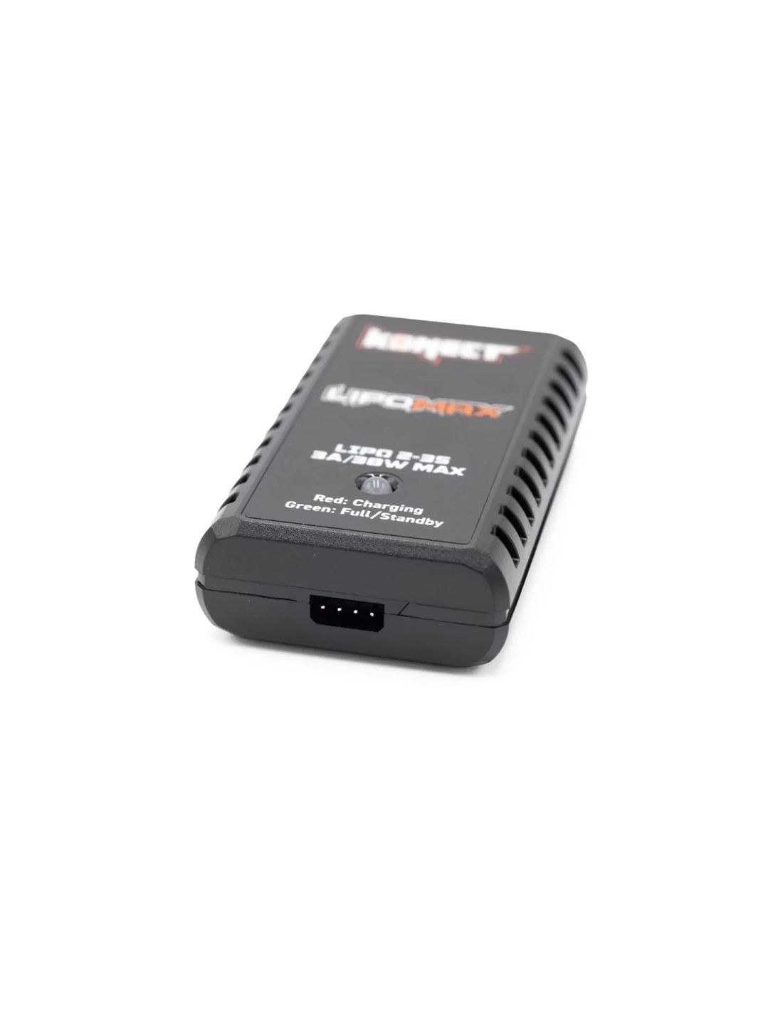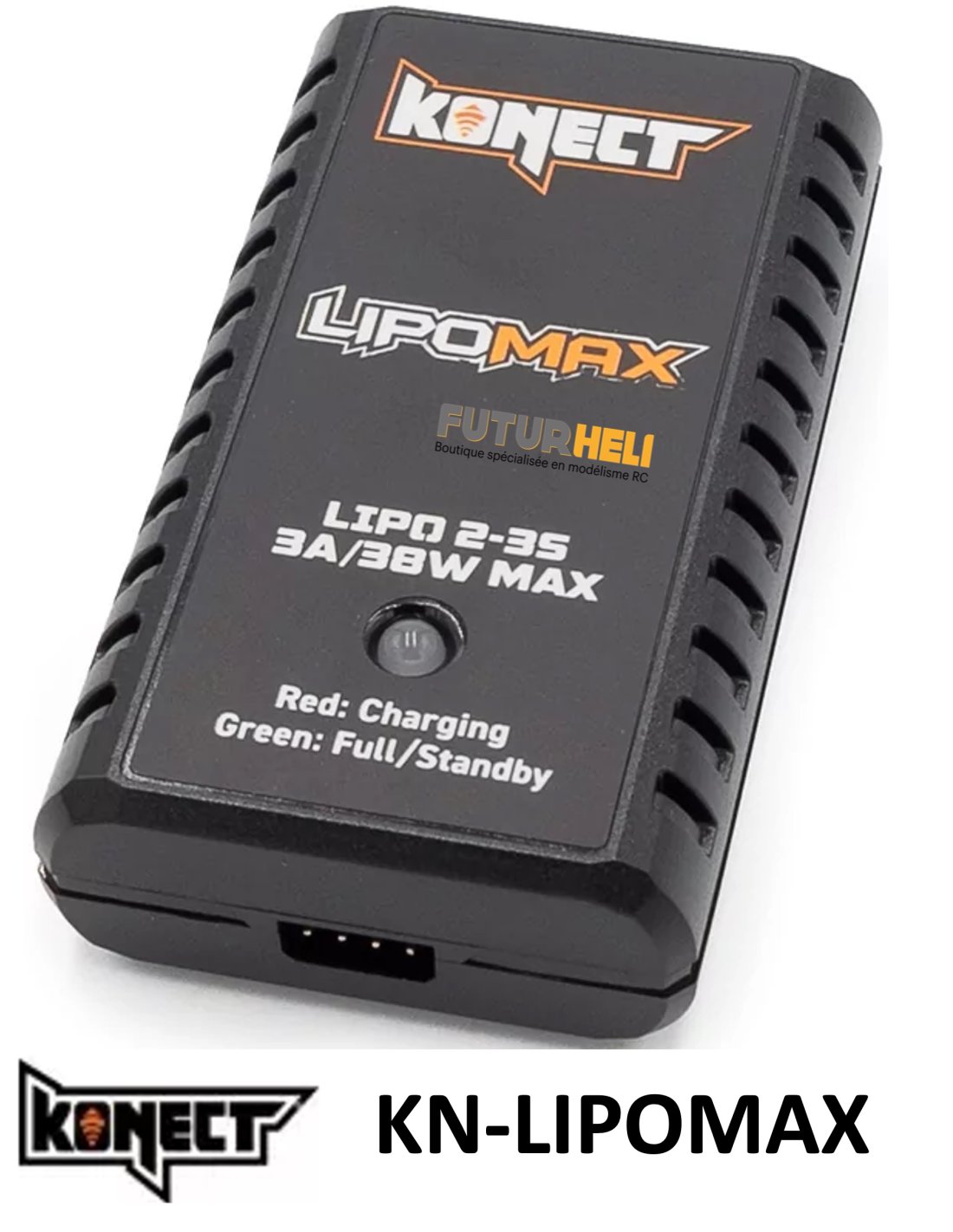 Chargeur compact Lipomax de chez Konect, utilisable partout grâce à son alimentation en USB il vous permettra des charger vos batteries en 2 ou 3 éléments lipo . Nous vous conseillons pour une charge sure et rapide un adaptateur 220 USb de qualité