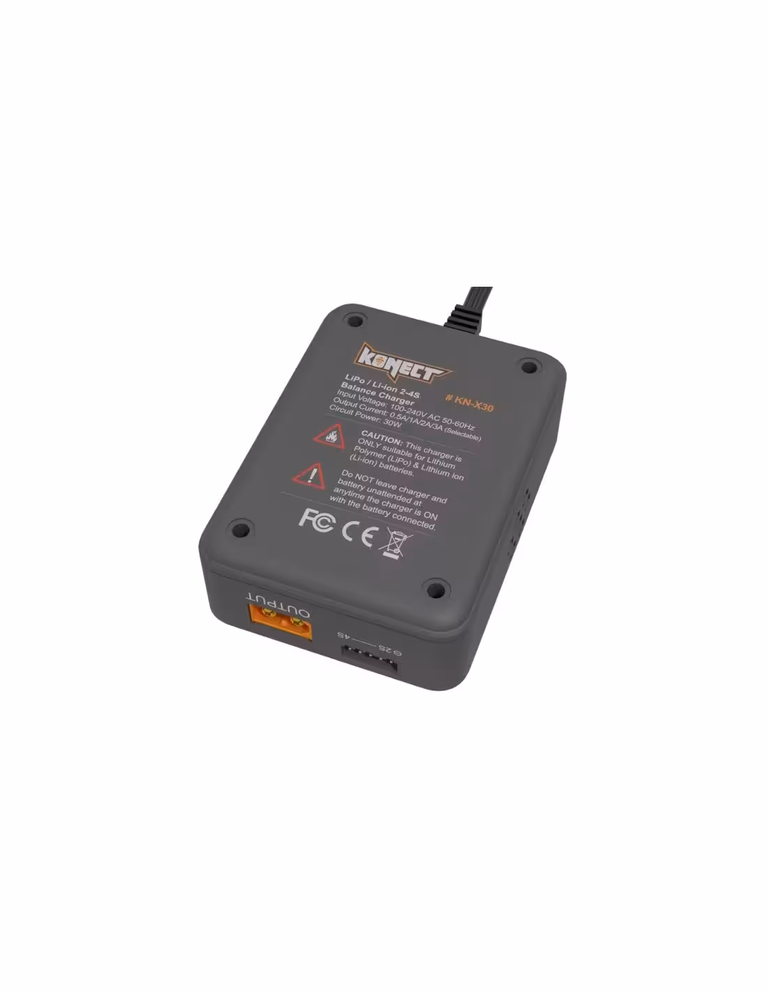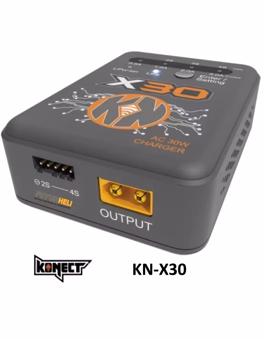 Le X30 de chez Konect est un chargeur puissant 30W compact qui pourra charger les batteries de type Lipo / Li ion / ou Life de 2 à 4 éléments . Il est alimenté en 220v .