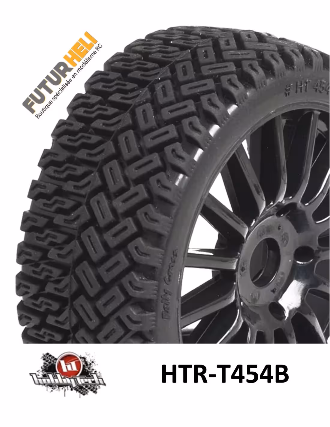 Roues complètes livrées par 2 pièces avec pneus de type Rally-cross collés sur jante batons noires avec hexagonal de 17 mm . Marque HRT Hobbytech utilisé sur la voiture Spirit Evo NXT brushless .