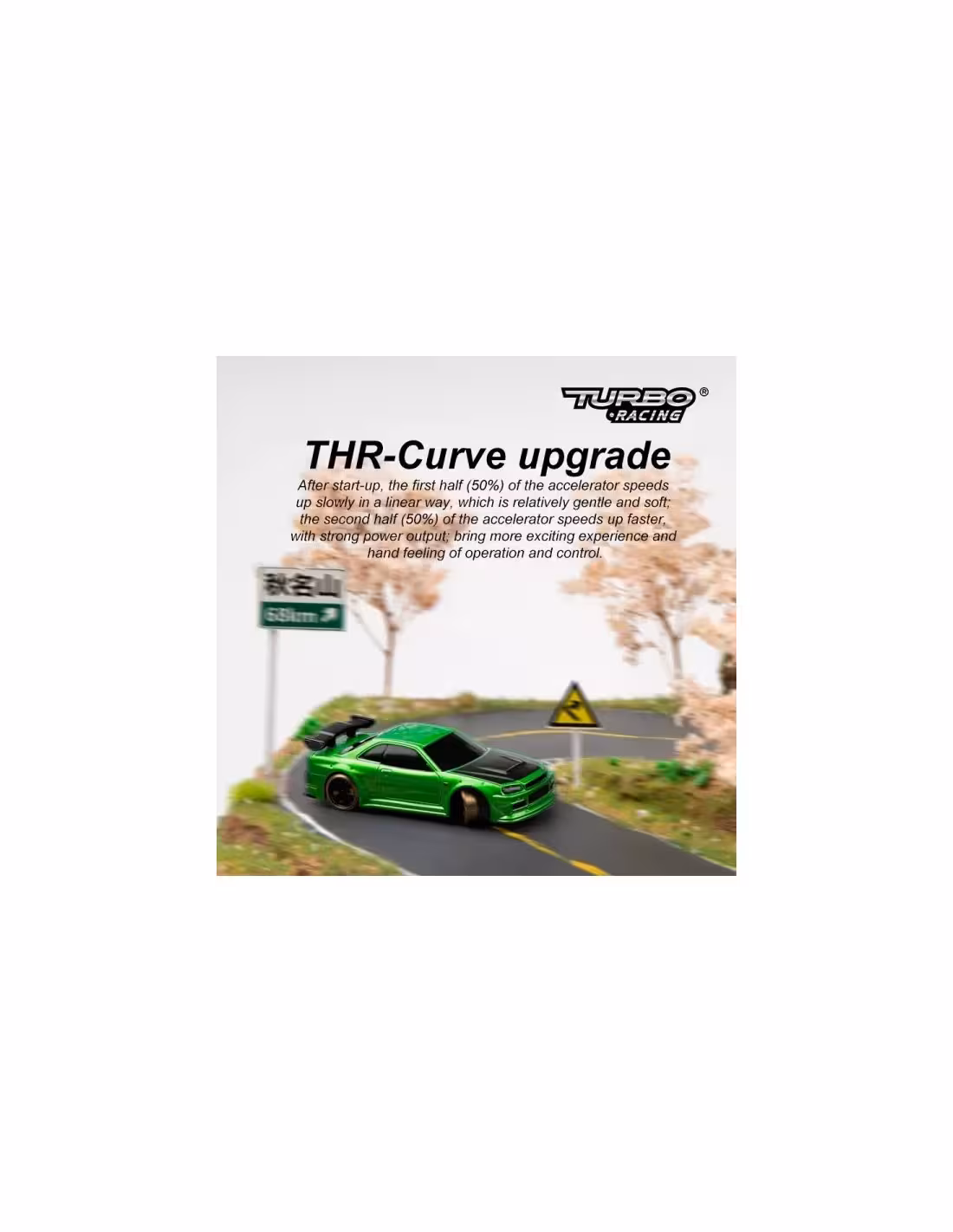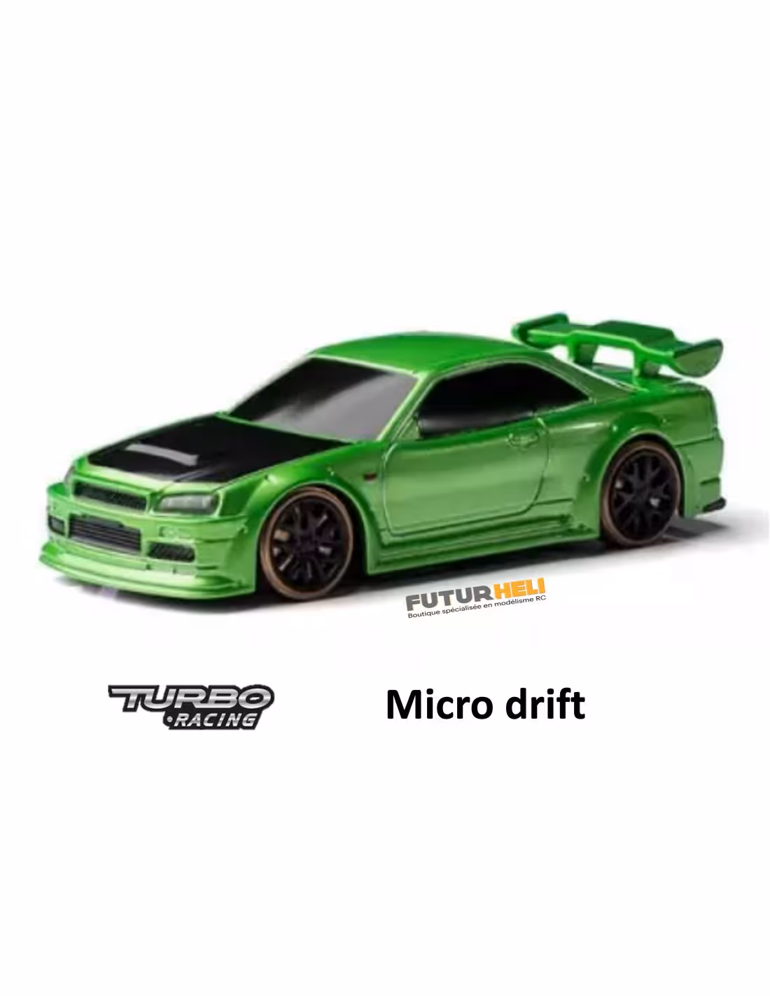 1/76ème Micro Drift Vert .Version Drift de la Turbo RacingPour cette version drift, Turbo Racing propose une micro voiture qui est équipée d'un gyro - indispensable pour une bonne glisse. Le gain du gyro se règle avec un bouton sur la radiocommande. Il faut le régler au point maxi juste avant que la voiture ne se mette à remuer de gauche à droite. Selon la glisse souhaitée (longue glisse ou glisse type donuts) on affine les réglages suivants : débattement de la direction et puissance moteur.