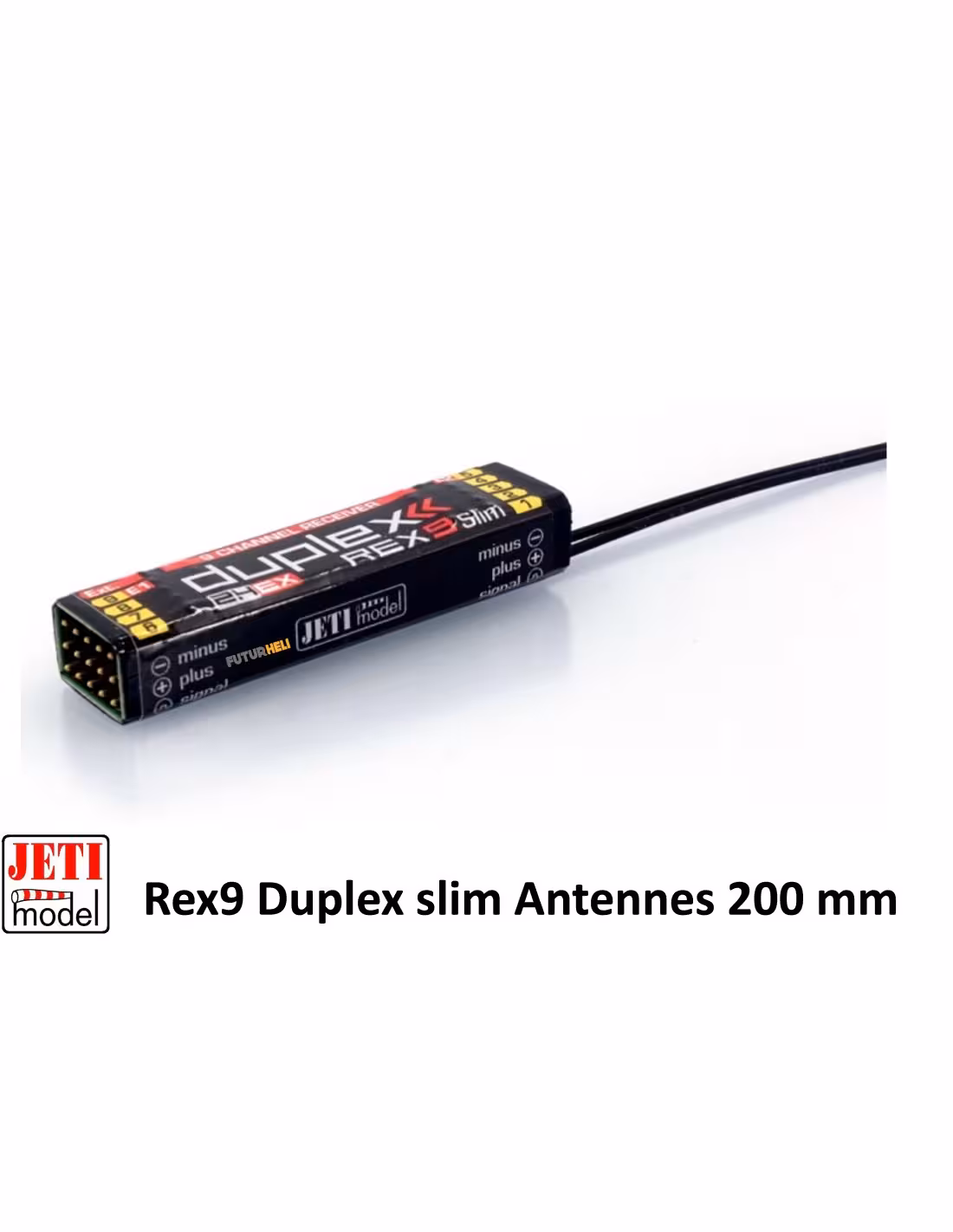 Un récepteur 9 voies qui est tout en longueur dimensions 60x46x13mm et parfaitement adapté aux endroits étroits comme les fuselages de planeur c'est REX 9 Slim avec 2 antennes de 200 mm .
