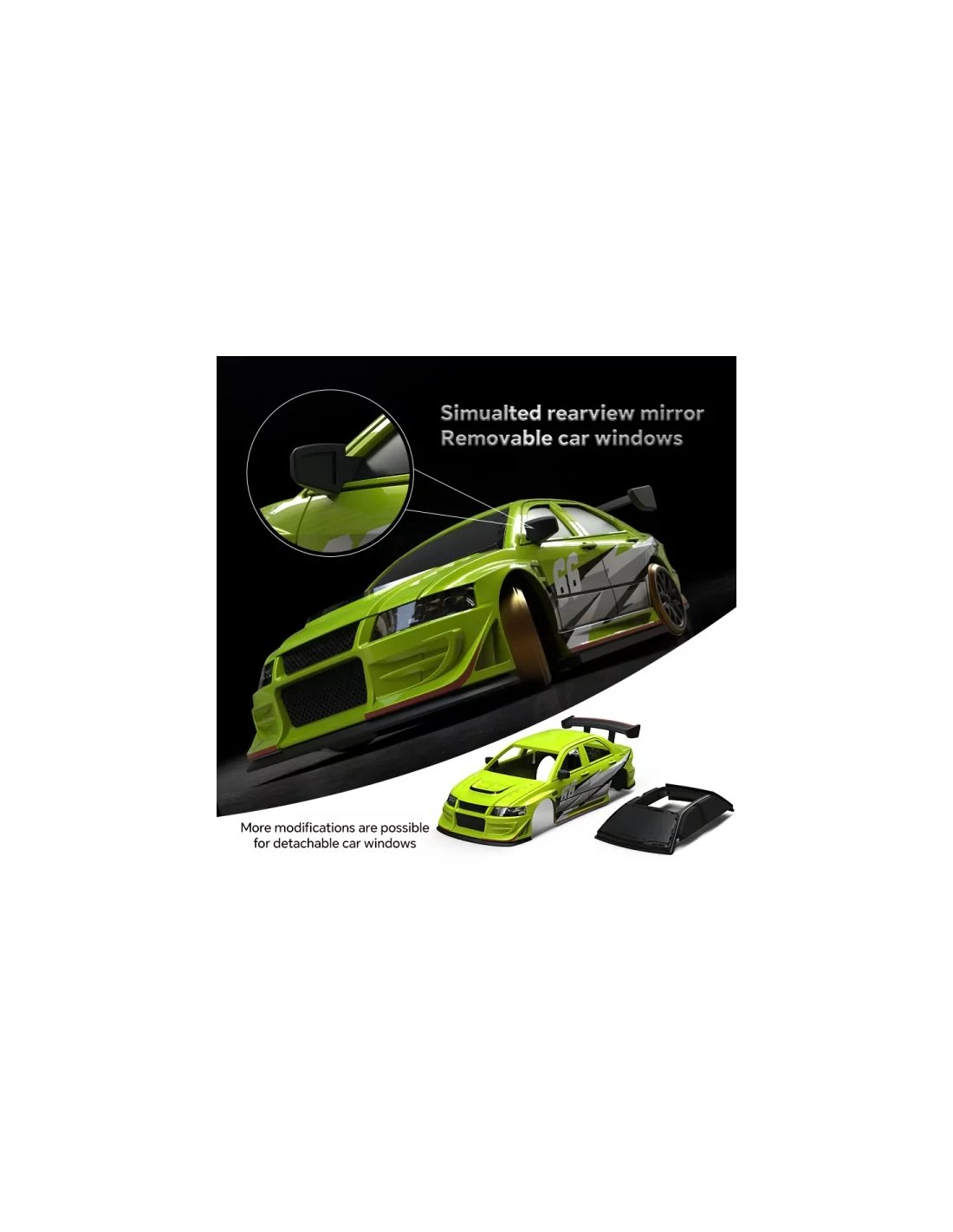 Grâce à sa petite taille, la C66 reproduit fidèlement les proportions et le comportement d’une voiture de drift réelle. Son centre de gravité abaissé et ses pneus spécifiques offrent un contrôle précis lors des glisses.