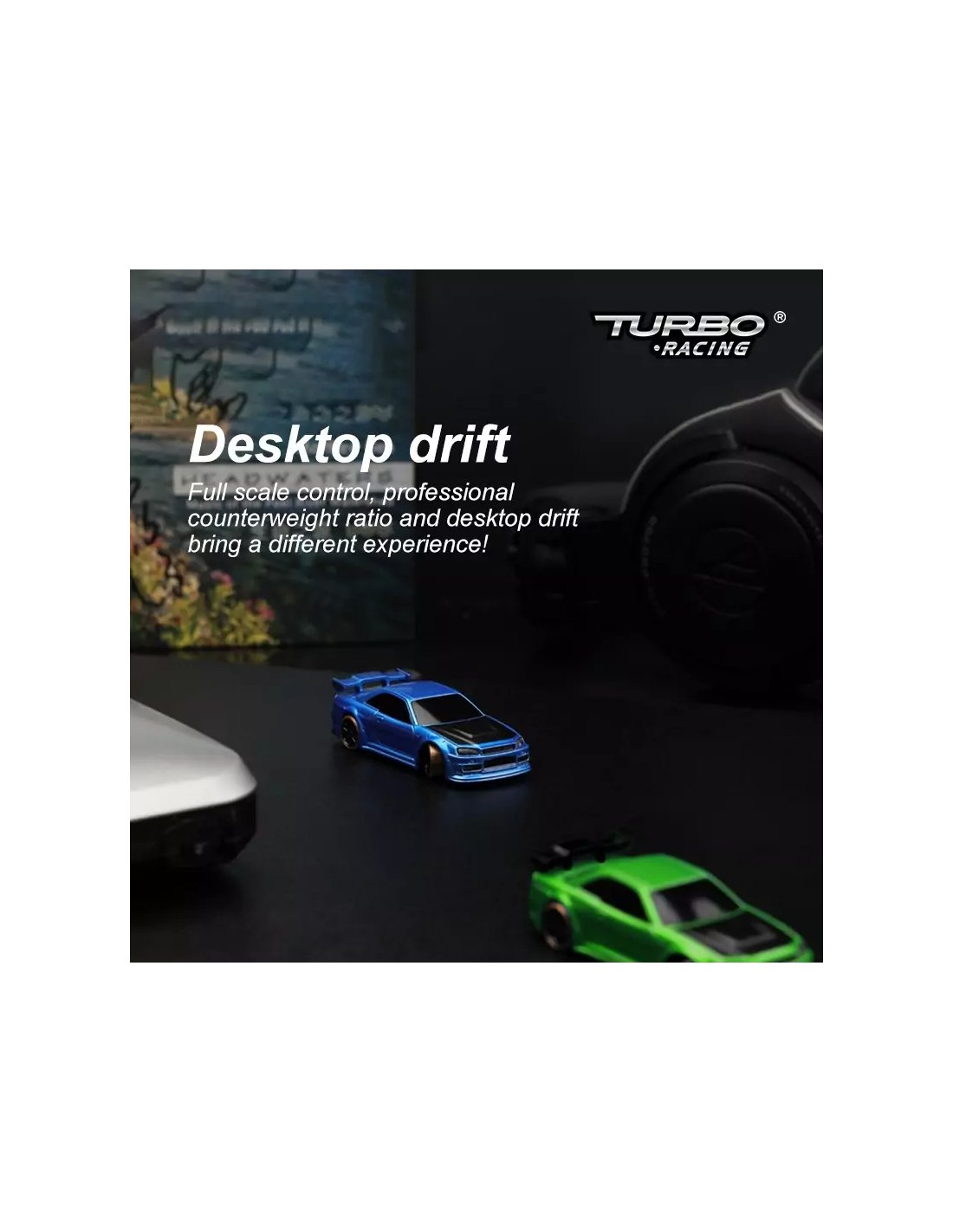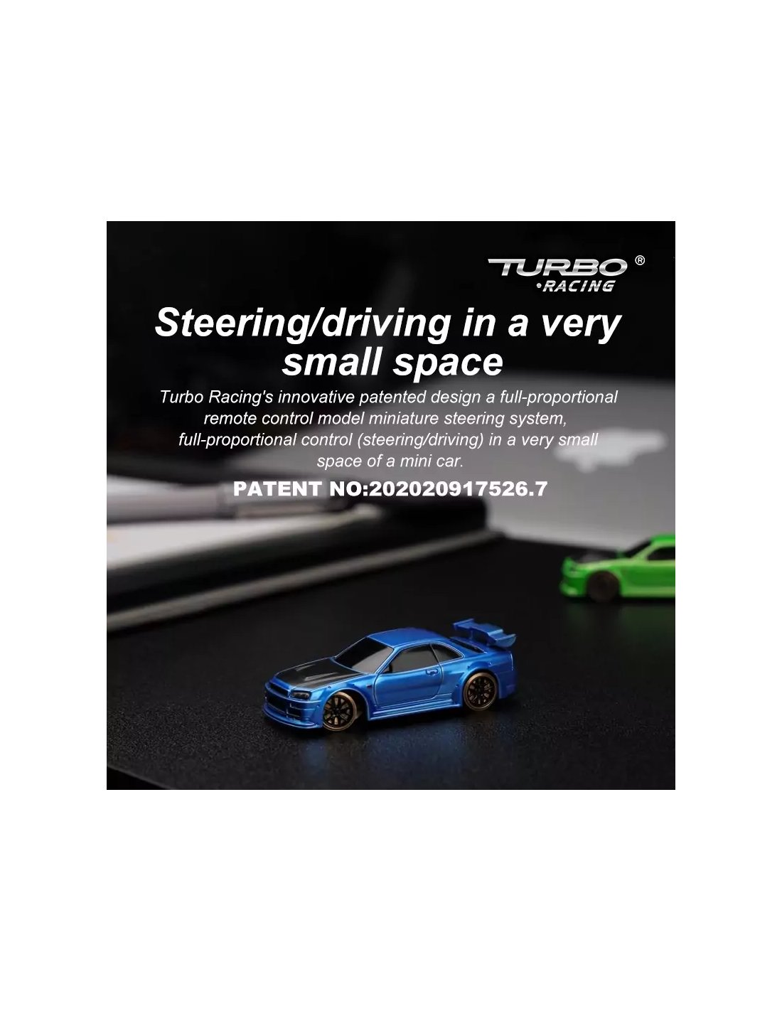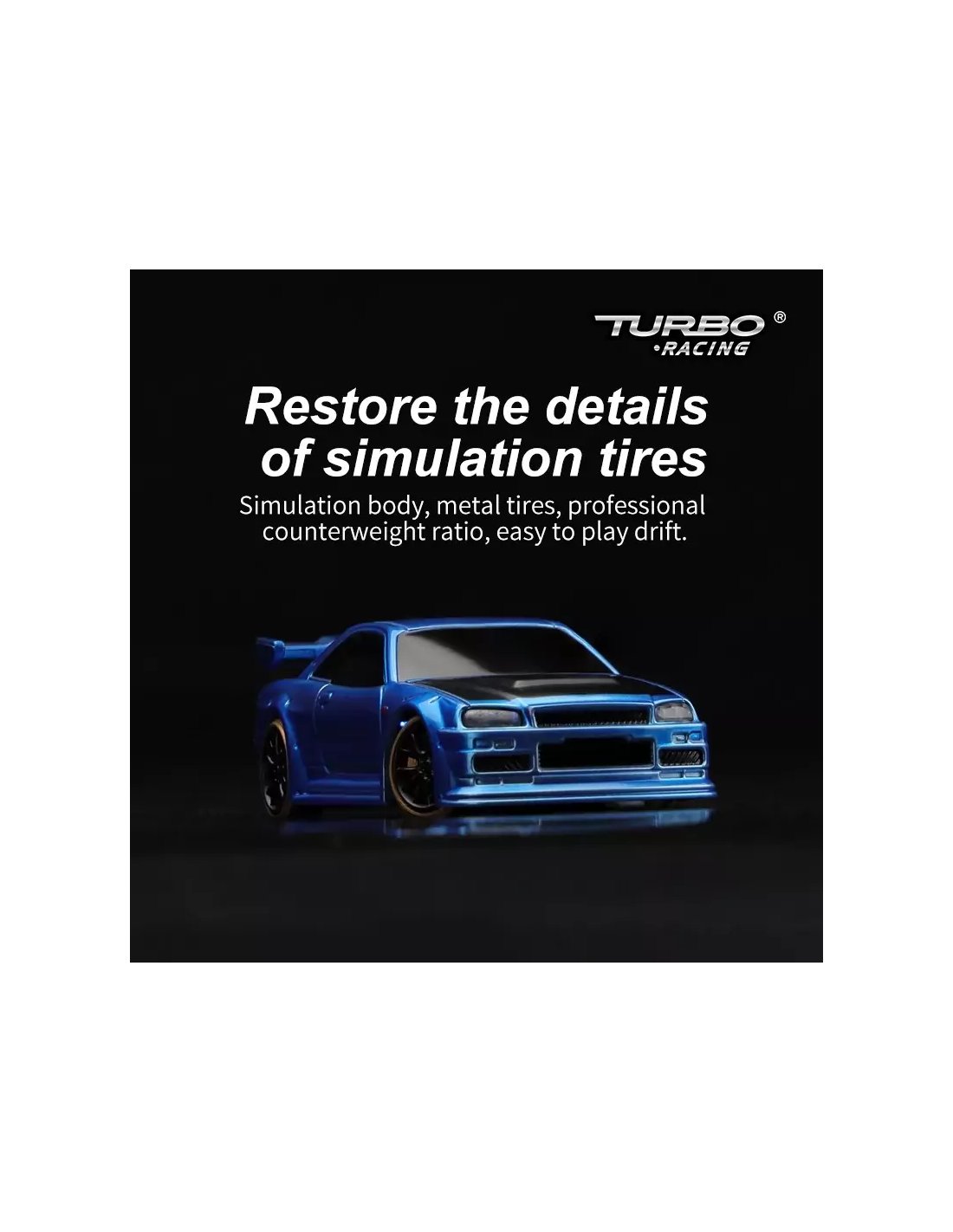 La Turbo Racing est une micro voiture RC au 1/76ème (elle tient sur un pouce de la main). Les commandes sont entièrement proportionnelles et similaires à des modèles de plus grandes échelles. La conduite est bluffante et accessible à tous (néophytes ou modélistes avertis). L'autonomie des voitures est de 40 minutes et la recharge se fait via une prise USB-C qui se trouve sous la voiture. Les Turbo Racing sont des voitures extrêmement fiables et il y a rarement de la casse. On peut rouler sur une table ou un plan de travail. Pour le tracé, il existe des pistes/tapis de différentes tailles mais on peut également envisager de construire et de décorer sa propre piste à la manière d'un train miniature (maquette de bâtiments, végétation, flocage...).